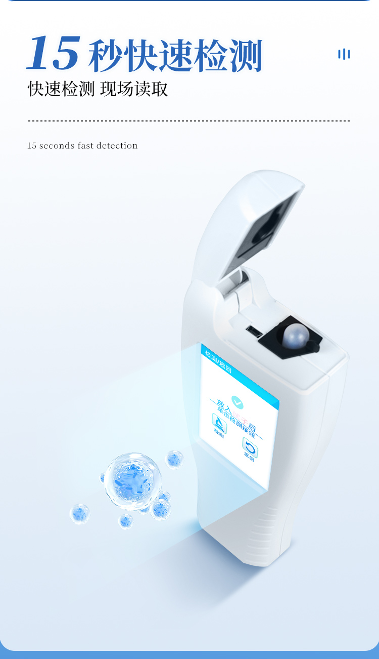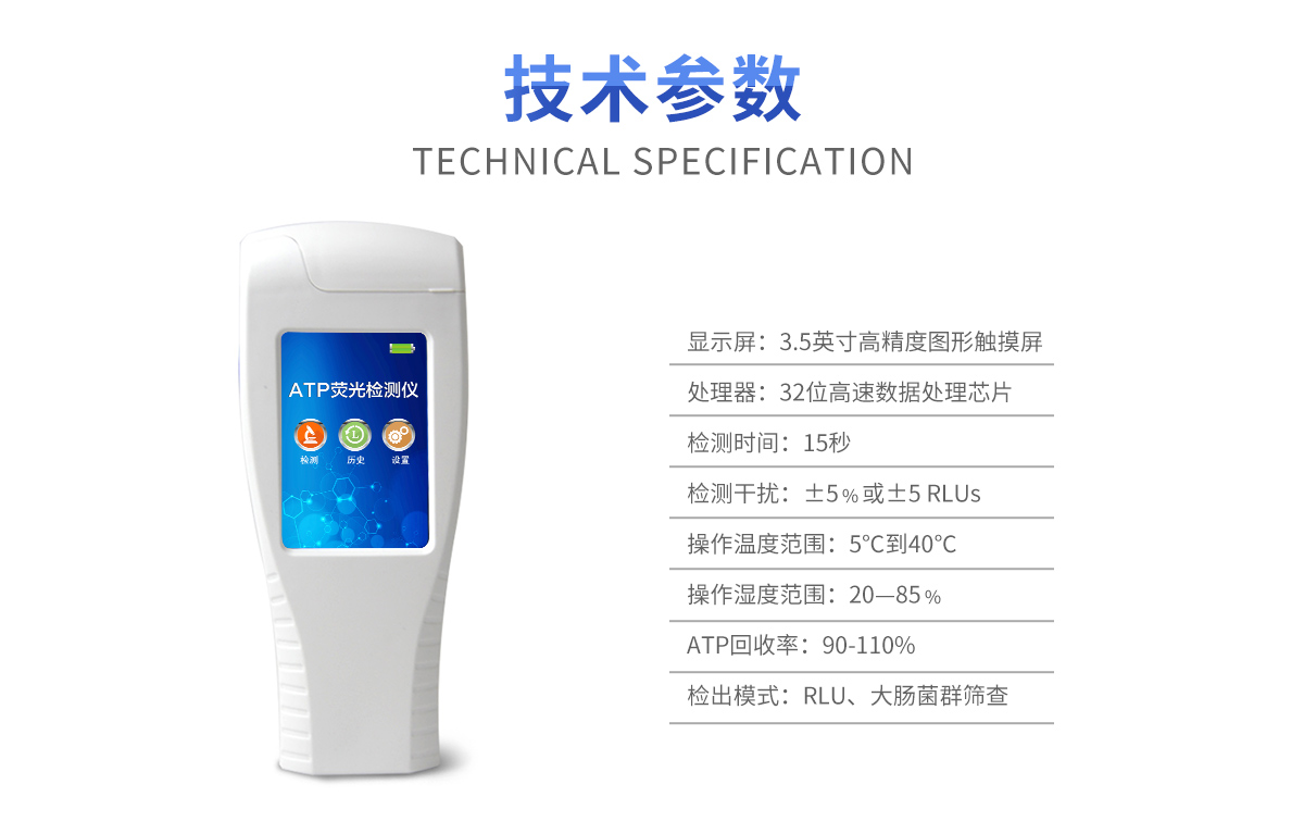 該設(shè)備為全新升級(jí)產(chǎn)品,大屏幕觸摸顯示屏,代替?zhèn)鹘y(tǒng)按鍵。操作采用生物化學(xué)反應(yīng)方法檢測ATP含量,ATP熒光檢測儀基于螢火蟲發(fā)光原理,利用“熒光素酶—熒光素體系”快速檢測三磷酸腺苷(ATP)。ATP拭子含有可以裂解細(xì)胞膜的試劑,能將細(xì)胞內(nèi)ATP釋放出來,與試劑中含有的特異性酶發(fā)生反應(yīng),產(chǎn)生光,再用熒光照度計(jì)檢測發(fā)光值,微生物的數(shù)量與發(fā)光值成正比,由于所有生物活細(xì)胞中含有恒量的ATP,所以ATP含量可以清晰地表明樣品中微生物與其他生物殘余的多少,用于判斷衛(wèi)生狀況。