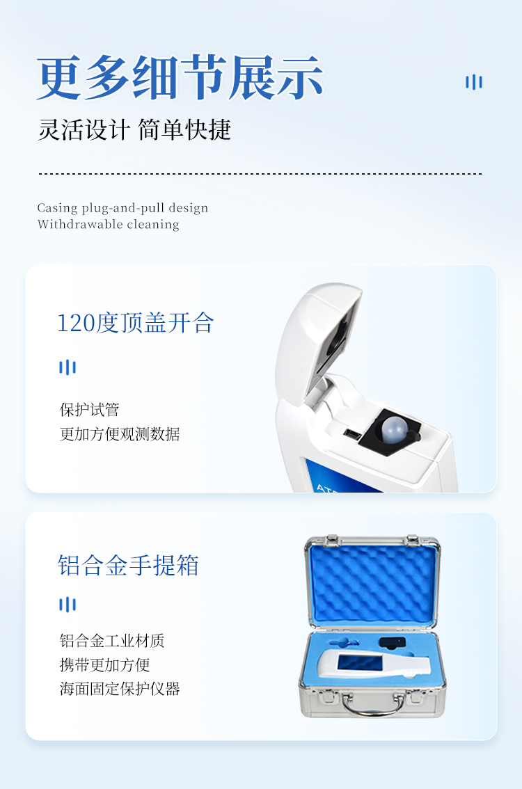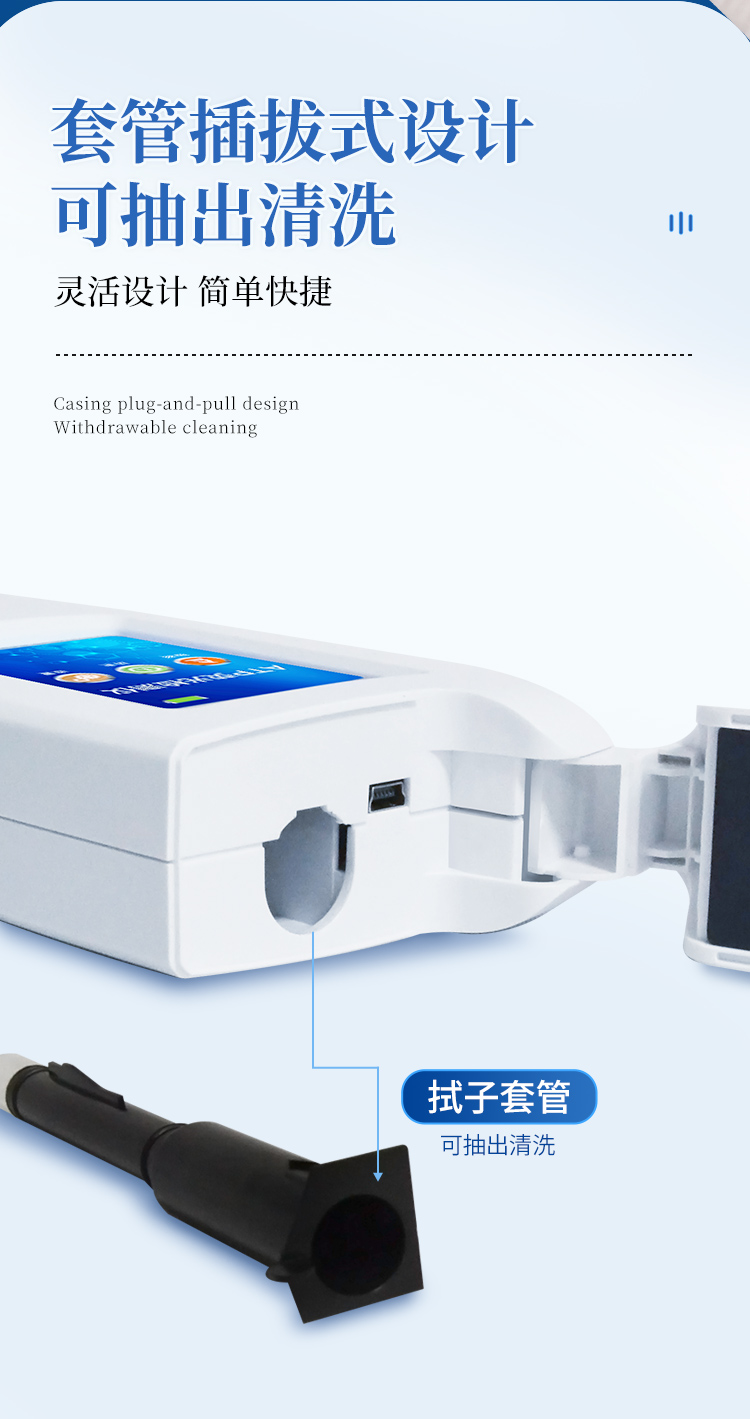 | 實(shí)用性 —— 可根據(jù)環(huán)境檢測需求設(shè)定上下限值,做到數(shù)據(jù)快速評(píng)估預(yù)警,表面潔凈度快速篩查。 | 靈敏度高 —— *************** | 速度快 —— 常規(guī)培養(yǎng)法18-24h以上,而ATP只需要十幾秒鐘 . | 可行性 —— 微生物數(shù)量與微生物體內(nèi)所含ATP有明確的相關(guān)性。 通過檢測ATP含量,可間接得出反應(yīng)中微生物數(shù)量 | 可操作性 —— 傳統(tǒng)培養(yǎng)方法需要在實(shí)驗(yàn)室由經(jīng)過培訓(xùn)的技術(shù)人員進(jìn)行操作;而ATP快速潔凈度檢測操作非常簡便,只需簡單的培訓(xùn)即可由一般工作人員進(jìn)行現(xiàn)場操作。 | 體驗(yàn)更好 —— 試子套管采用插拔式靈活設(shè)計(jì),可定期清洗長期使用,延長儀器壽命。 |