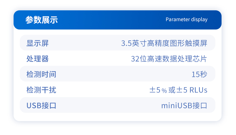 | 顯示屏:3.5英寸高精度圖形觸摸屏 | 處理器:32位高速數(shù)據(jù)處理芯片 | 檢測精度:********** | 大腸菌群:******** | 檢測范圍:*************** | 檢測時(shí)間:15秒 | 檢測干擾:±5﹪或±5 RLUs | 操作溫度范圍:5℃到40℃ | 操作濕度范圍:20—85﹪ | ATP回收率:90-110% | 檢出模式:RLU、大腸菌群篩查 | 50個(gè)用戶ID 設(shè)定 | 可設(shè)定的結(jié)果限值個(gè)數(shù):251個(gè) | 自動(dòng)判斷合格與不合格 | 自動(dòng)統(tǒng)計(jì)合格率 | 內(nèi)置自校光源 | 開機(jī)30秒自檢 | 配有miniUSB接口,可將結(jié)果上傳至PC | 配備專用軟件驅(qū)動(dòng)U盤代替?zhèn)鹘y(tǒng)光盤 | 儀器尺寸(W×H×D):188 mm×77mm×37mm | 使用可充電鋰電池免電池更換 | 備用狀態(tài)(20℃):6個(gè)月 | 中文操作手冊 | 穩(wěn)定的液體熒光素酶 | 潤濕的一體化采集拭子 |