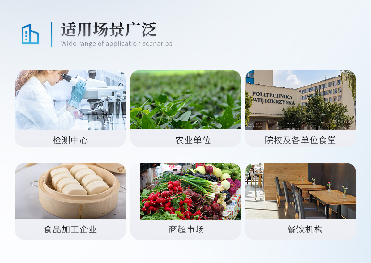 該多功能食品安全檢測儀為集成化食品安全快速檢測分析設備,廣泛應用于市場監管局、食品肉產品深加工企業、學校食堂、衛生部門、畜牧部門、屠宰場、檢驗檢疫部門等單位使用。