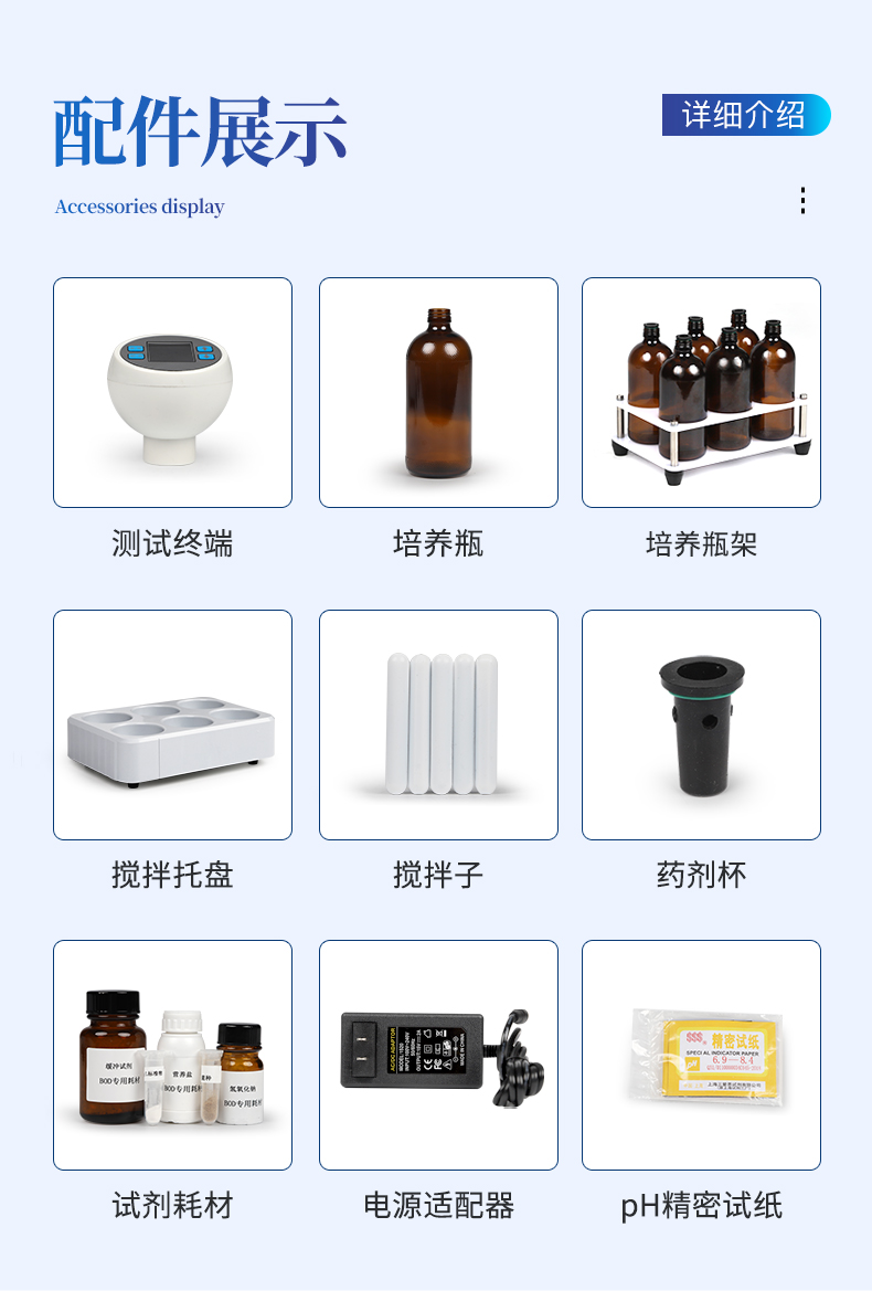 1. 可同時測量六個樣品; 2. 六個獨立測試終端,在檢測過程中可隨時加入新的測量組; 3. 直接讀取BOD濃度值、無需計算; 4. 無汞壓差設計,精度高,無需換算,且保證實驗人員安全健康; 5. 實驗環(huán)節(jié)無管路設計,避免管路老化、漏氣等弊端; 6. 測量范圍可選擇,在水樣濃度低于4000g/L時,無需稀釋; 7. 測定儀自動記錄測量數(shù)據(jù),一個測試周期可選60個采樣點、檢測數(shù)據(jù)更**; 8. 培養(yǎng)周期可調節(jié),根據(jù)需求可以選擇; 9. 自動完成測量過程,無需專人值守; 10. 大尺寸液晶顯示屏,直觀明了,項目選擇方便; 11. 測試終端自帶大容量電池,電池壽命2年以上,測試過程中不受外部環(huán)境短期斷電影響; 12.記錄頻率2h記錄一次.