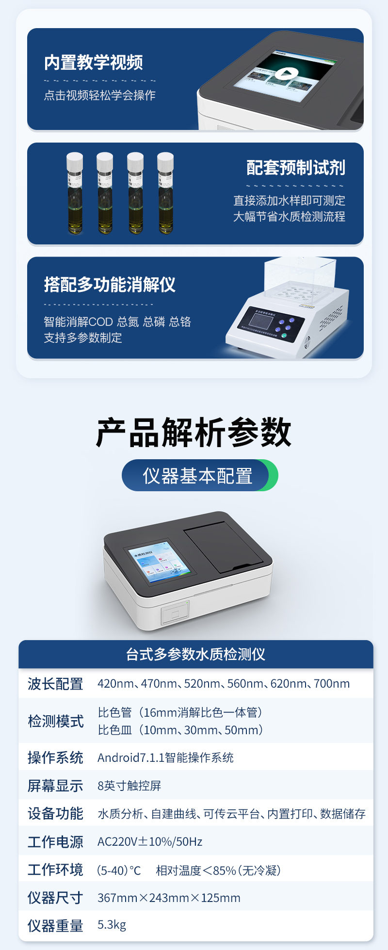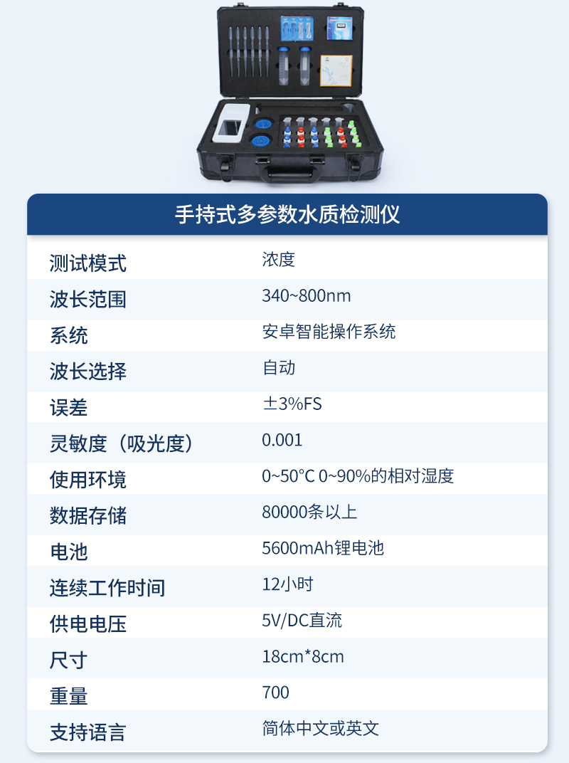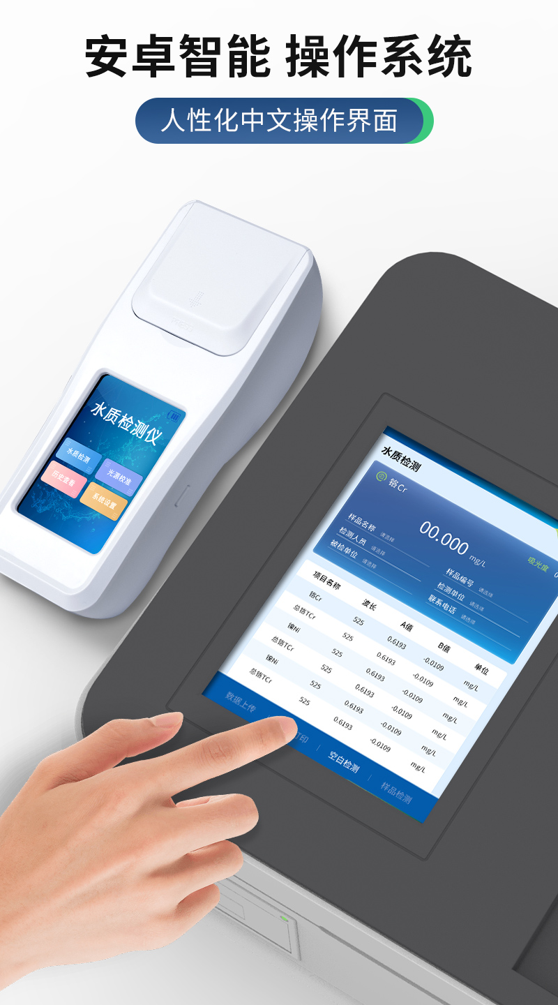 引導(dǎo)式檢測(cè)模式,降低了學(xué)習(xí)成本,使用者可以簡(jiǎn)單快速的上手操作,內(nèi)置COD、氨氮等水質(zhì)檢測(cè)參數(shù)。