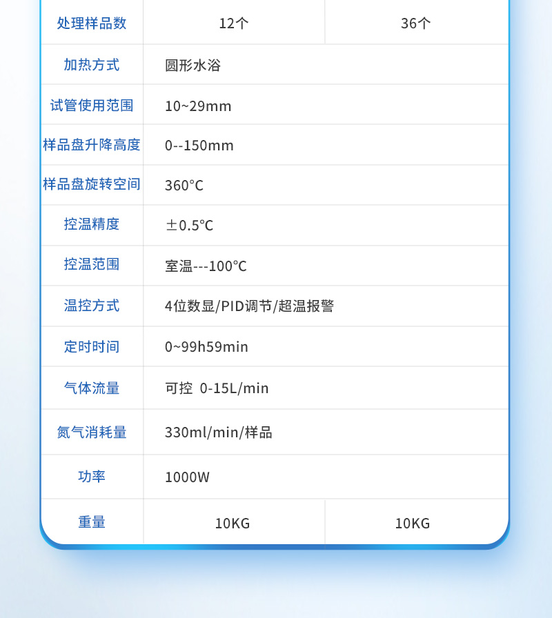 | 產(chǎn)品型號 | 處理樣品數(shù) | 孔徑尺寸 | 氮氣消耗量 | 氣體流量計 | 標(biāo)配加熱塊數(shù) | 控溫精度 | 控溫范圍 | 溫控方式 | 外形尺寸 | 功率 | 重量 |