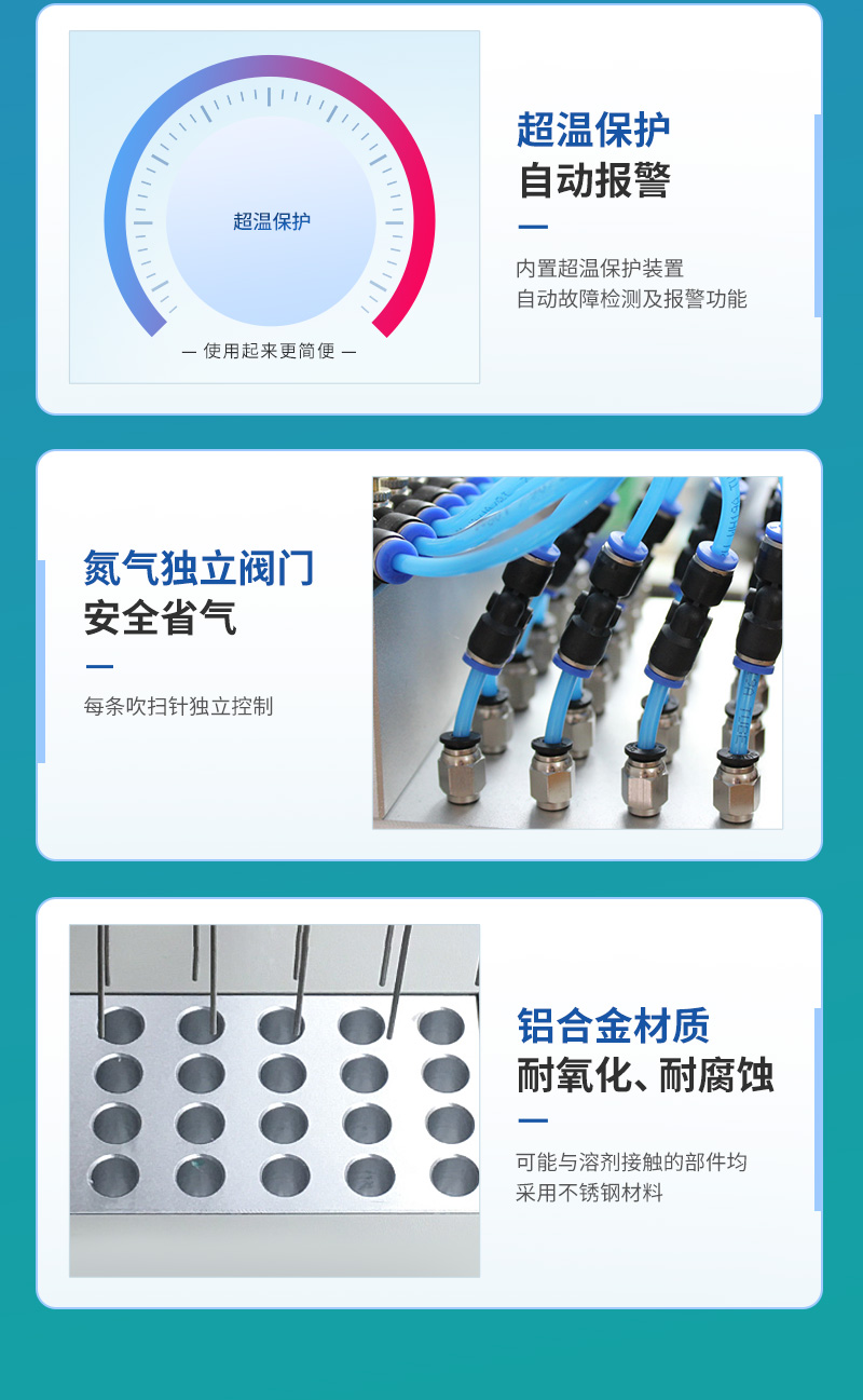 | 每個吹針都可以獨立控制,避免引起交叉污染。 | 儀器氣腔高度可以自行調(diào)節(jié),配備標(biāo)準(zhǔn)氣針長度為15厘米。 | 氮吹儀有36個氣道控制開關(guān),節(jié)約氣體,每根吹氣針的位置可獨立改變吹掃位置,使之適用不同的樣品容器及不同的樣品位置 | 在濃縮有毒溶劑時,整個系統(tǒng)可置于通風(fēng)柜中,降低危險。 | 內(nèi)置超溫保護(hù)裝置,自動故障檢測及報警功能,方便實用。 | 儀器有LED顯示屏,溫度同步顯示、時間遞減顯示,可時時觀察溫度變化。 | 具有整體溫度更均勻,加熱速度快 | 本產(chǎn)品還可以作為普通的干式恒溫器使用 | 使用起來更簡便,而且溫度也可以達(dá)到150℃,可以更好濃縮樣品 |
