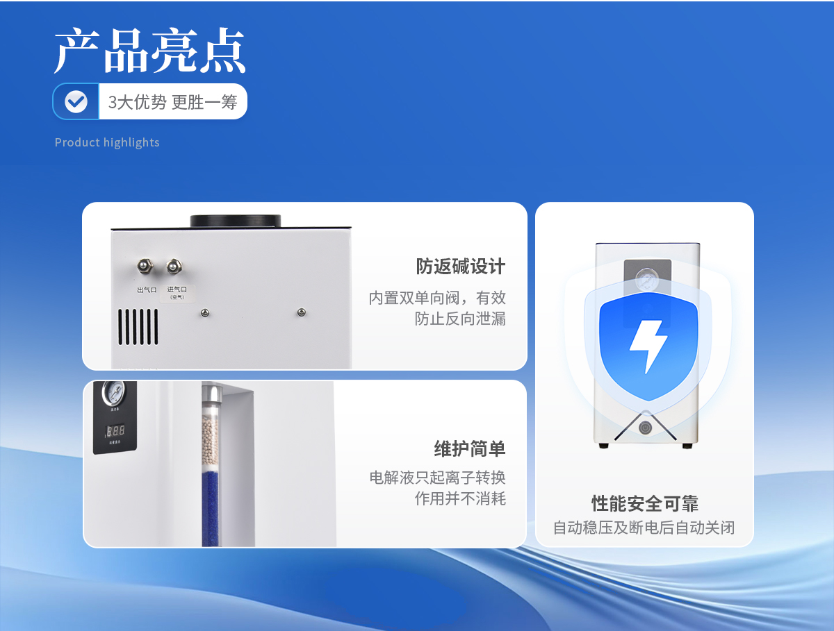 1、可取代高壓氮氣瓶,使實驗室儀器化。 2、操作簡便,只需啟動電源開關,儀器即可產氮且輸出壓力穩定。 3、不消耗電解液;電解液只起離子轉換作用并不消耗,所以只需補充因蒸發而損失的少量蒸餾水。 4、產氣純度高,空氣經電解池分離后即可得到高純氮氣。 5、性能安全可靠:具有穩壓和斷電后自動關閉氣路功能。 6、壽命長,既可間斷使用,又可連續使用且產氣量穩定、不衰減。 7、**節能:采用**的開關電源,提高了電解效率。 8、配有雙單向閥,自動防返堿。