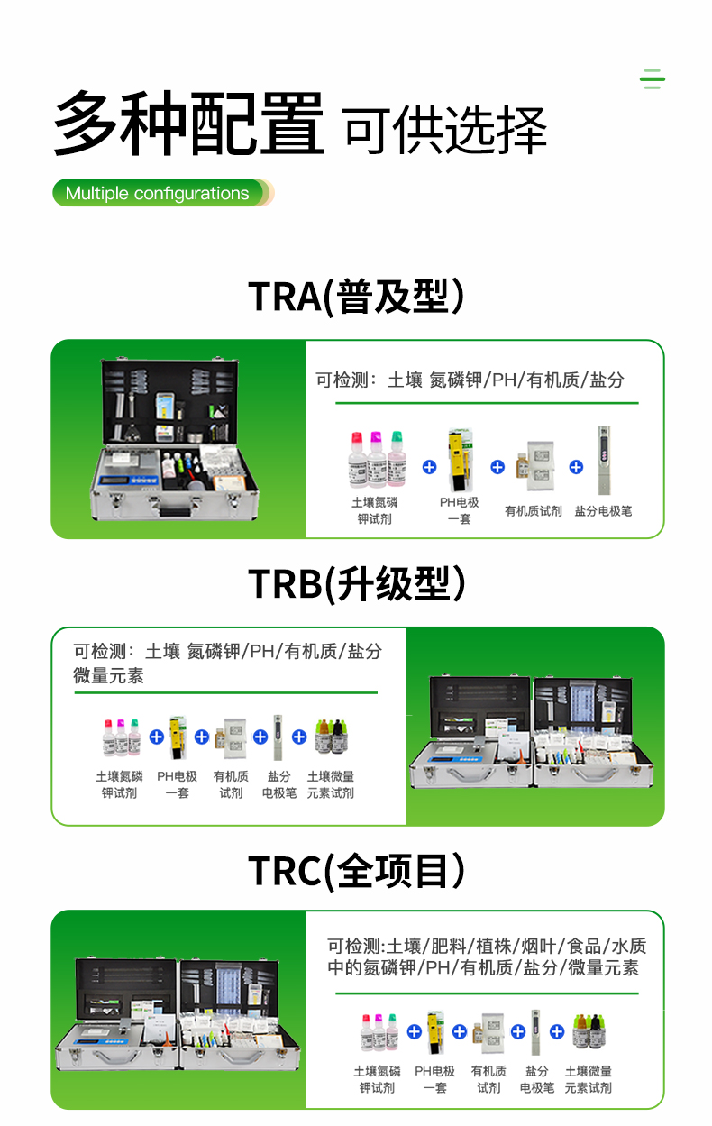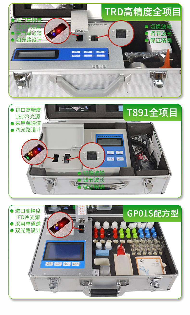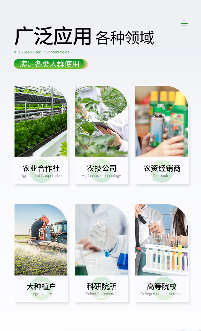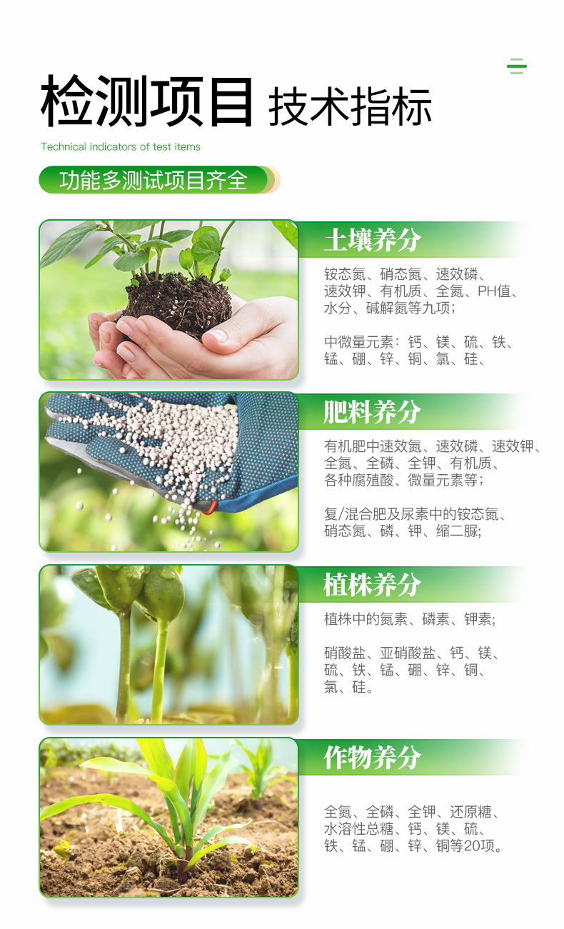 肥料養分:● 單質化肥中的氮、磷、鉀; ● 復(混)合肥及尿素中的銨態氮、硝態氮、磷、鉀、縮二脲; ● 有機肥(葉面肥)中速效氮、速效磷、速效鉀、全氮、全磷、全鉀、有機質,各種腐植酸等。可擴展檢測鈣、鎂、硫、鐵、錳、硼、鋅、銅、氯、硅等微量元素以及各種重金屬(鉛、鉻、鎘、汞、砷)。