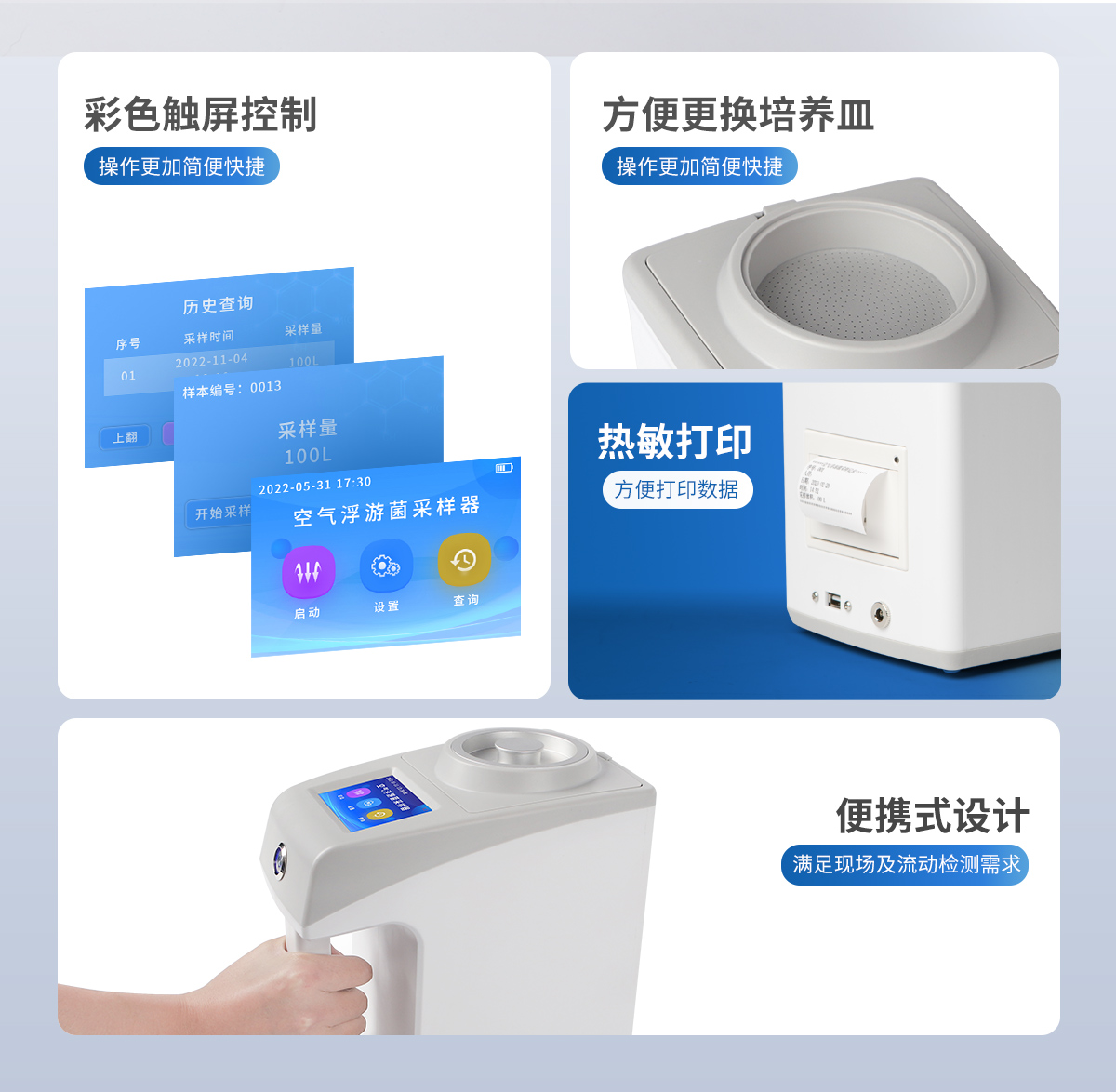 ●新型手持式外觀,美觀大方,使用方便。 ●彩色觸屏控制,操作更加**快捷。 ●LCD顯示采樣量,采樣時(shí)間等參數(shù)。 ●可將采樣量,采樣時(shí)間等參數(shù)按組儲(chǔ)存。 ●更換培養(yǎng)皿簡(jiǎn)便,拿下采樣口即可更換培養(yǎng)皿。 ●帶熱敏打印機(jī),方便打印數(shù)據(jù)。 ●帶上位機(jī)軟件,數(shù)據(jù)可導(dǎo)出電腦,方便歷史分析。 ●交直流兩用,內(nèi)置6000mAh大容量鋰電池,可連續(xù)采樣8小時(shí)。 ●程序支持中文或英文。