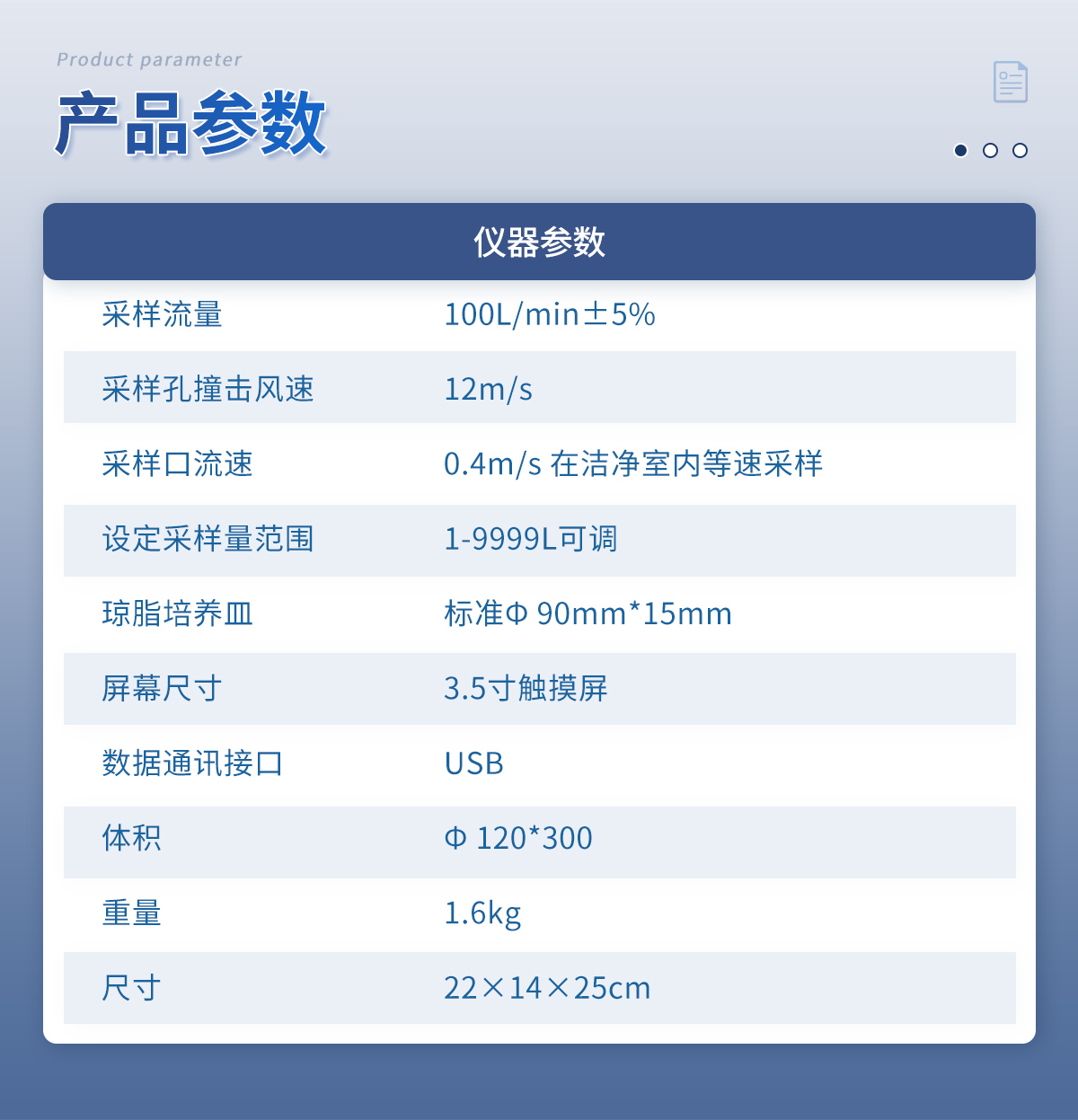 采樣流量:100L/min±5% 采樣孔撞擊風(fēng)速:12m/s 采樣口流速:0.4m/s 在潔凈室內(nèi)等速采樣 設(shè)定采樣量范圍:1-9999L可調(diào) 瓊脂培養(yǎng)皿:標(biāo)準(zhǔn)? 90mm*15mm 屏幕尺寸:3.5寸觸摸屏 數(shù)據(jù)通訊接口:USB 體積:Φ 120*300 重量:1.6kg 尺寸:22×14×25cm