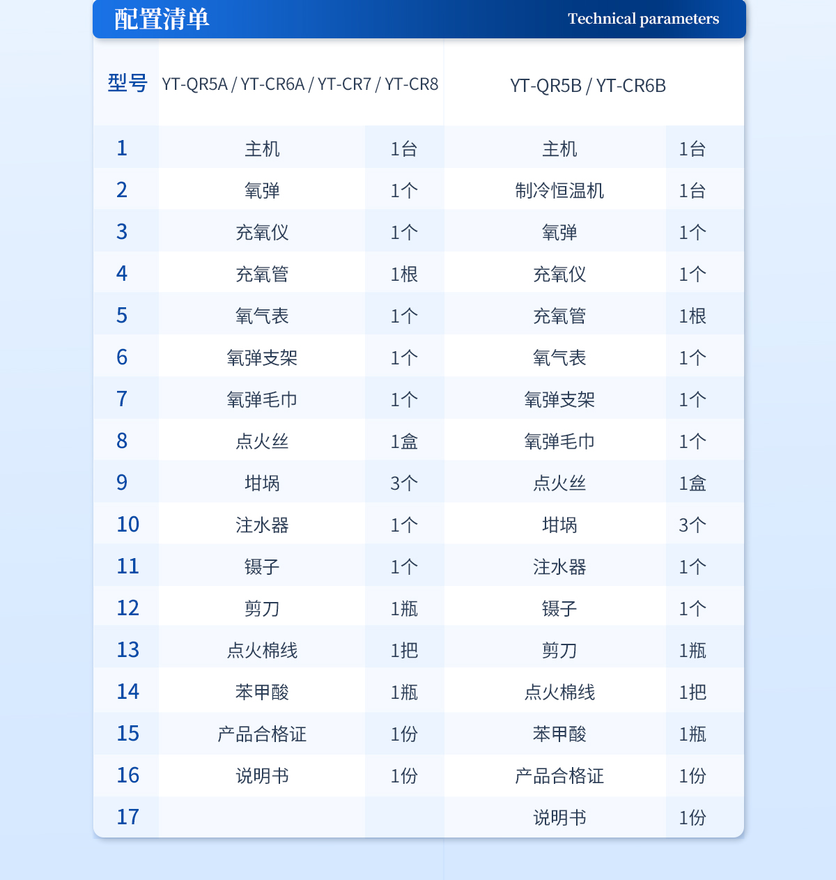 | 主機 1臺 | 氧彈 1個 | 充氧儀 1個 | 充氧管 1根 | 氧氣表 1個 | 氧彈支架 1個 | 氧彈毛巾 1個 | 點火絲 1盒 | 坩堝 3個 | 注水器 1個 | 鑷子 1個 | 剪刀 1瓶 | 點火棉線 1把 | 苯甲酸 1瓶 | 產品合格證 1份 | 說明書 1份 |