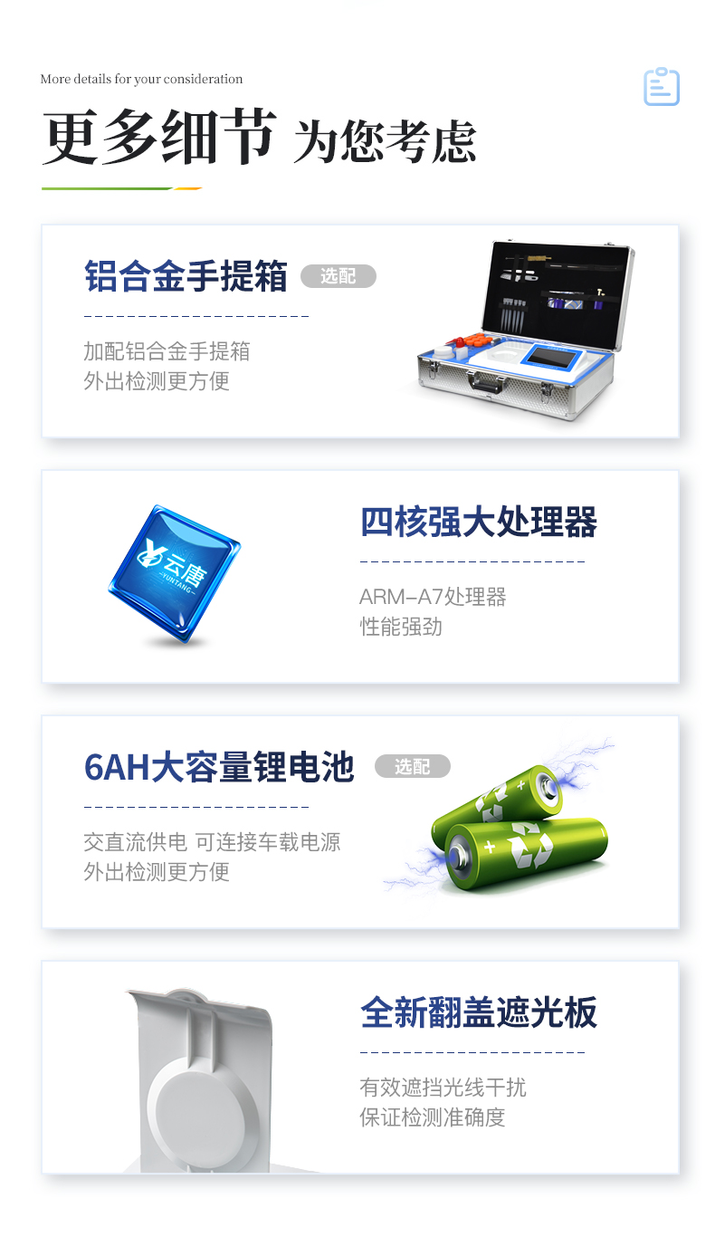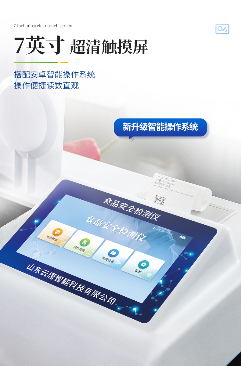 | 1、儀器采用臺(tái)式一體化系統(tǒng)檢測(cè)技術(shù),將分光光度模塊、數(shù)字化管理模塊、無(wú)線通訊模塊高度集成于一體,支持檢測(cè)幾十種食品安全檢測(cè)項(xiàng)目,同時(shí)預(yù)留升級(jí)檢測(cè)方法。 | 2、儀器檢測(cè)模塊標(biāo)準(zhǔn)化、智能化,檢測(cè)項(xiàng)目可隨意自由組合。檢測(cè)箱體內(nèi)置多個(gè)標(biāo)準(zhǔn)檢測(cè)單元,檢測(cè)模塊可以調(diào)整配置。 | 3、顯示屏幕:儀器采用7英寸液晶觸摸屏,搭配運(yùn)行安卓智能操作系統(tǒng),主控芯片采用ARM Cortex-A7,RK3288/4核處理器,主頻1.88Ghz,操作方便,性能更強(qiáng)。 | 4、檢測(cè)通道:≥12通道;采用精密旋轉(zhuǎn)比色池設(shè)計(jì),使用同芯片同光源校準(zhǔn)精度,解決不同光源之間的誤差值,更加準(zhǔn)確**。 | 5、儀器光源:高精度進(jìn)口四波長(zhǎng)冷光源,每個(gè)通道均配置 410、520、590、630nm 波長(zhǎng)光源,標(biāo)配**的光路切換裝置,專(zhuān)利光路切換功能可實(shí)現(xiàn)64波長(zhǎng),并且所有檢測(cè)項(xiàng)目可實(shí)現(xiàn)所有通道同時(shí)檢測(cè)。 | 6、通訊接口:配備無(wú)線通信模塊、可選配4G(APN)通訊模塊和藍(lán)牙傳輸,同時(shí)具有USB接口,可以多方式實(shí)現(xiàn)數(shù)據(jù)保存及數(shù)據(jù)傳輸。 | 7、存儲(chǔ)方式:支持U盤(pán)存儲(chǔ),標(biāo)準(zhǔn)USB接口,免驅(qū)動(dòng)安裝。檢測(cè)結(jié)果存儲(chǔ)容量20萬(wàn)條以上,可生成Excel表格進(jìn)行拷貝,并具有登錄保護(hù)功能。 | 8、智能化操作系統(tǒng): | 8.1、操作系統(tǒng):儀器可在同一檢測(cè)界面自動(dòng)對(duì)應(yīng)相關(guān)檢測(cè)通道,一次性選擇1-12個(gè)樣品名稱(chēng),無(wú)需退出界面,節(jié)省操作時(shí)間。并可以對(duì)每個(gè)通道屬性和樣品信息單獨(dú)進(jìn)行編輯,例如送檢單位、人員,檢測(cè)人員等,打印時(shí)勾選打印顯示。 | 8.2、限量規(guī)判系統(tǒng):具有限量查詢(xún)、添加物質(zhì)合規(guī)判定系統(tǒng)。檢測(cè)出結(jié)果后,系統(tǒng)自動(dòng)調(diào)用系統(tǒng)數(shù)據(jù)庫(kù)中相關(guān)國(guó)標(biāo)進(jìn)行比對(duì)判定,客觀顯示結(jié)果是否合格。 | 8.3、數(shù)據(jù)監(jiān)管系統(tǒng):同步對(duì)接監(jiān)管平臺(tái),數(shù)據(jù)可局域網(wǎng)和互聯(lián)網(wǎng)數(shù)據(jù)上傳,檢測(cè)結(jié)果可選擇直接傳至食品安全監(jiān)管平臺(tái)。進(jìn)行區(qū)域食品安全監(jiān)管及大數(shù)據(jù)分析處理與數(shù)據(jù)統(tǒng)計(jì),檢測(cè)區(qū)域食品安全長(zhǎng)短期動(dòng)態(tài),達(dá)到食品安全問(wèn)題預(yù)估、預(yù)警。 | 8.4、打印系統(tǒng):內(nèi)置全新打印機(jī),可以打印:項(xiàng)目名稱(chēng),二維碼,抽樣信息、檢測(cè)信息,受檢信息、復(fù)核信息、抽樣日期、檢測(cè)日期等信息的打印。 | 9、供電模式:儀器交直流兩用,直流12V供電(標(biāo)配),可連接車(chē)載電源,亦可選配6ah大容量充電鋰電池,電量可實(shí)時(shí)顯示,方便戶(hù)外流動(dòng)測(cè)試。 | 10、儀器具有重新校準(zhǔn)、鎖定、恢復(fù)出廠設(shè)置功能, | 11、外觀尺寸:415X310X150(mm) ,并可加配鋁合金手提箱 |