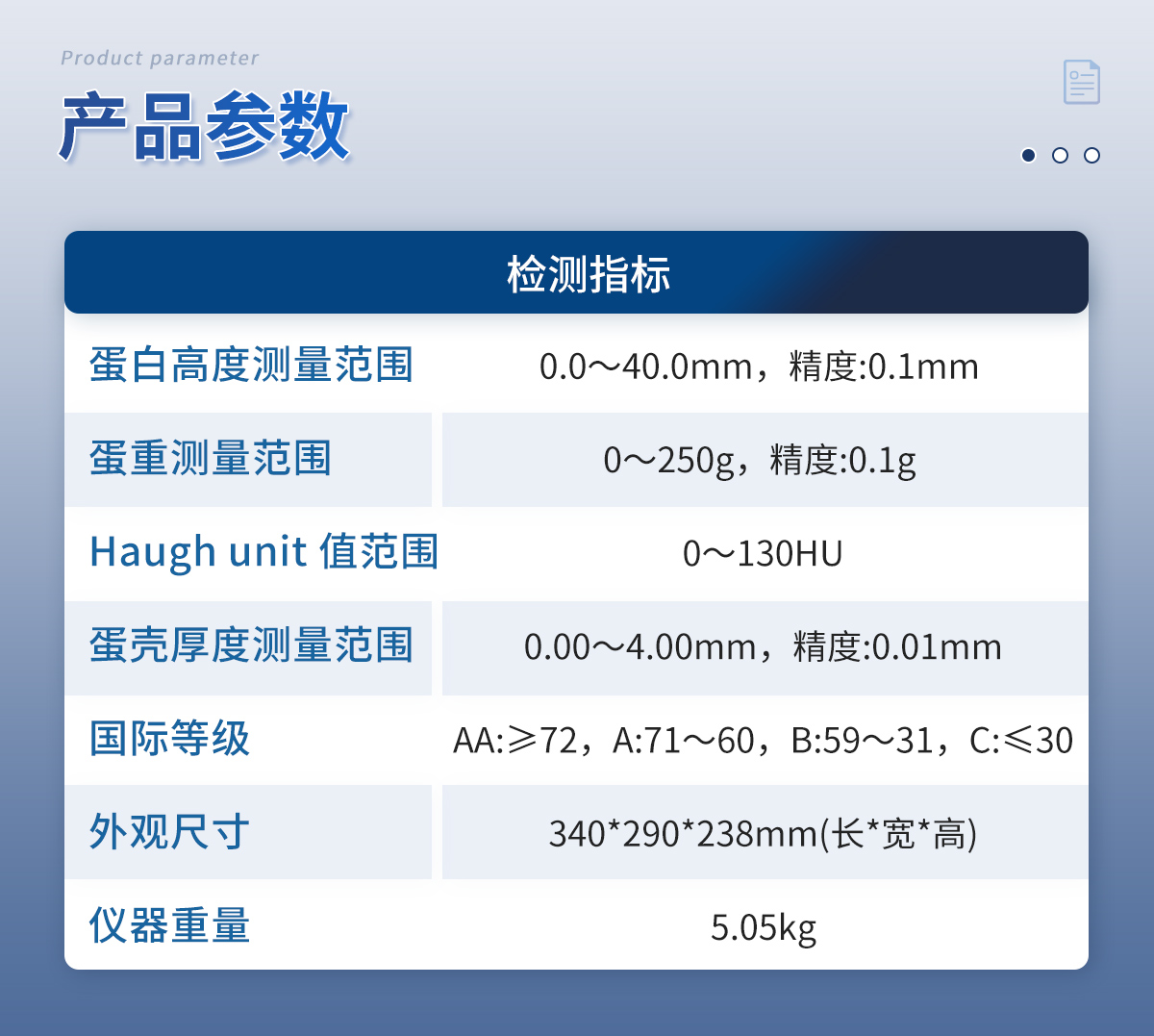 雞蛋品質分析儀技術指標:雞蛋測重,蛋白測高,蛋黃測色,哈夫值顯示,蛋黃高度,蛋殼厚度等,可進行雞蛋等級計算。雞蛋的哈夫值是美國農業部蛋品標準規定的檢驗和表示蛋品新鮮度的指標,目前我們國內也是以該指標為準,該指標中主要分為四個等級,AA級:72或者更高;A級:71~60;B級:59~31;C級:30或更低。