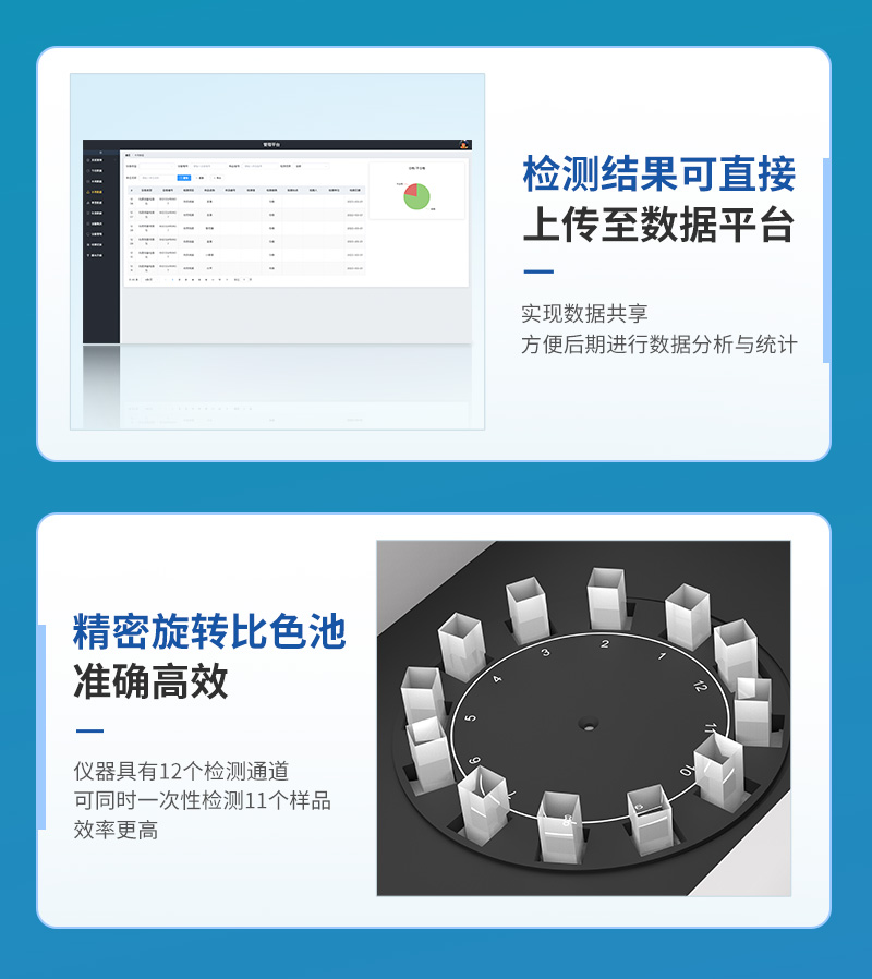 | 該儀器采用ARM Cortex-A7,RK3288/4核處理器,搭配運行安卓智能操作系統,集實驗操作,分析結果,打印報告等功能于一體,使用方便,性能更強。 | 儀器采用7.1英寸液晶觸摸屏,單機即可操作,無需連接外部顯示設備或控制裝置。 | 設備具有12個檢測通道,可一次性檢測11個樣品,效率更高。 | 儀器采用精密旋轉比色池設計,使用同光源校準精度,檢測結果更為準確**。 | 設備具有數據存儲功能,設備可以存儲數據100000組,可在屏幕上直觀查看歷史數據,可導出數據。 | 設備自帶打印功能,可對樣品信息及檢測結果無限次隨意打印。 | 該儀器模塊化高度集成,同步設有數字化管理模塊、無線通訊模塊,可將檢測結果進行分析,直接上傳至數據平臺,實現數據共享,方便后期進行數據分析與統計。 | 儀器采用高度智能化系統,儀器自動對檢測結果與國標限量值進行對比,自動判定樣品是否合格,結果更為直觀。 | 本設備可以針對檢測樣品信息,對每個通道屬性單獨進行編輯,例如受檢單位,檢測人員等。 | 設備具有過壓保護、防靜電干擾、防磁場干擾等功能 | 該設備可進行技術性遠程升級,更新程序,無需返廠,并且后期我司將持續免費更新系統版本,降低使用成本及運輸損耗風險。 |