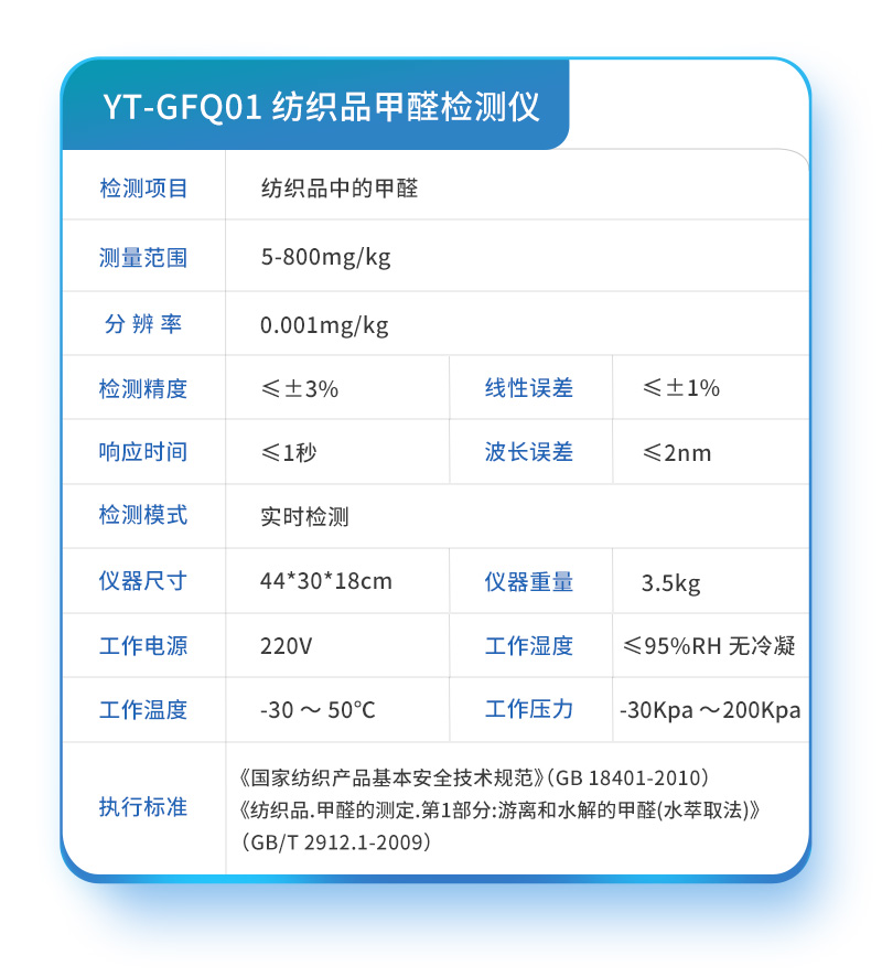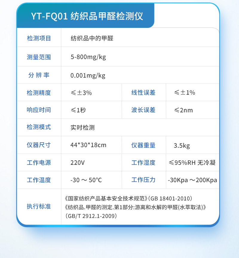 該紡織品甲醛檢測設備滿足紡織品甲醛含量檢測的中國標準《國家紡織產品基本安全技術規范》(GB 18401-2010)、《紡織品.甲醛的測定.第1部分:游離和水解的甲醛(水萃取法)》(GB/T 2912.1-2009), 適合各種紡織品、服裝等的甲醛含量檢測。