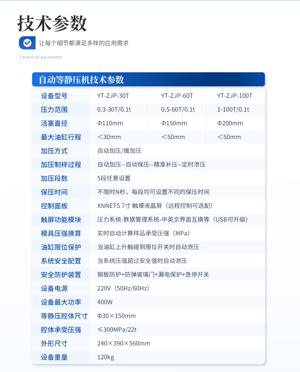 | 規格型號:YT-ZJP-30T | 壓力范圍:0.3-30T/0.1t | 活塞直徑 :Φ110mm | **油缸行程:<30mm | 加壓方式:自動加壓/緩加壓 | 加壓制樣過程:自動加壓--自動保壓--精準補壓--定時泄壓 | 加壓段數:5段任意設置 | 保壓時間 :不限時N秒,每段均可設置不同的保壓時間 | 控制面板:XNNETS 7寸 觸摸液晶屏(遠程控制可選配) | 觸屏功能模塊:壓力系-統-數據管理系統--中英文界面互換等(USB可升級) | 模具壓強換算:實時自動計算樣品承受壓強(MPa) | 油缸限位保護:當油缸上升觸碰到限位開關時自動泄壓 | 系統安全配置:當系統壓強超過安全值時自動泄壓 | 安全防護裝置:鋼板防護+防彈玻璃門+漏電保護+急停開關 | 設備電源:220V(50Hz/60Hz) | 設備**功率:400W | 等靜壓腔體尺寸:Φ30×150mm | 腔體承受壓強:≤300MPa/22t | 外形尺寸:240×390×560mm | 設備重量:120kg | 配置說明:等靜壓機1臺!可根據需求定制500MPa等靜壓機或橡膠模具 |