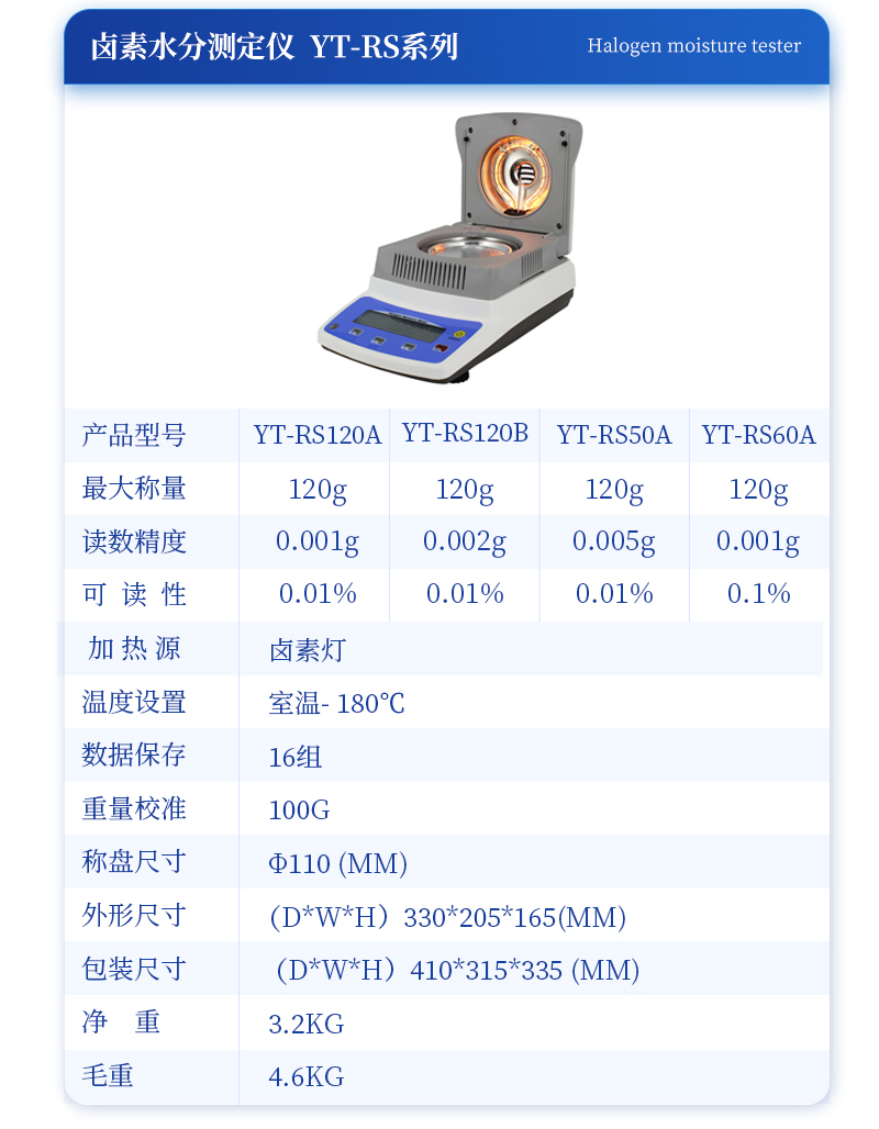 | 型號 :YT-RS120A,**稱量值:120g ,顯示分度值:0.001g,可 讀 性 :0.01% | 型號 : YT-RS120B,**稱量值:120g ,顯示分度值: 0.002g ,可 讀 性 :0.01% | 型號 : YT-RS50A,**稱量值:120g ,顯示分度值: 0.005g ,可 讀 性 :0.01% | 型號 : YT-RS60A,**稱量值:120g ,顯示分度值: 0.01g ,可 讀 性 :0.1% | 加 熱 源 鹵素?zé)? 溫度設(shè)置 室溫- 180℃ | 數(shù)據(jù)保存 16組 重量校準(zhǔn) 100g | 稱盤尺寸 φ110 (mm) | 外形尺寸 (D*W*H)330*205*165(mm) | 包裝尺寸 (D*W*H)410*315*335 (mm) | 凈 重 3.2kg 毛 重 4.6kg |
