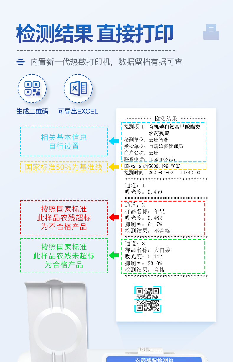 | 乙酰膽堿酯酶和丁酰膽堿酯酶試劑均可以使用,符合國家標準和農(nóng)業(yè)部標準的要求。 | 自動判斷樣品是否合格,檢測結(jié)果更加直觀。 | 儀器具有100多種蔬菜名稱菜單庫,分類管理,并可按需添加或刪除蔬菜名,編輯蔬菜名稱,可直接打印出蔬菜名稱。 | 檢測通道:12個檢測通道,可以同時測試多個樣品,循環(huán)檢測,即放即檢,每個樣品由程序控制分別獨立工作,不會互相干擾。 | 智能操作系統(tǒng),采用更加人性化操作,主控采用多核處理器,主頻1.88Ghz,運轉(zhuǎn)速度更快速,穩(wěn)定性更強。 | 顯示方式:7英寸高靈敏真彩觸摸屏顯示,人性化中文操作界面,讀數(shù)直觀、簡單。 | 打印機采用串口5v打印,可選擇手動打印或者自動打印,三分鐘出打印結(jié)果,打印格式為檢測人姓名、吸光度差值、檢測時間、檢測機構、樣品名稱及結(jié)果判定。 | 光源采用進口超高亮發(fā)光二極管,具有低功耗、高精度、穩(wěn)定性強、光源可控可以關掉不使用的光源,響應速度快等優(yōu)點。 | 智能恒流穩(wěn)壓,光強自動校準,長時間連續(xù)工作光源無溫漂現(xiàn)象。 | 儀器具有GPRS遠傳功能,可插手機卡實現(xiàn)數(shù)據(jù)遠傳平臺,wifi聯(lián)網(wǎng)功能,可將數(shù)據(jù)快速上傳電腦,進行數(shù)據(jù)管理與統(tǒng)計。 | 采用USB2.0接口設計,方便數(shù)據(jù)的存貯和移動,并可隨時與計算機直接相連,并且可用計算機控制儀器。實現(xiàn)數(shù)據(jù)查詢、瀏覽、分析、統(tǒng)計、打印等。 | 智能化程度高,儀器具有自檢功能:具有開機自檢和調(diào)零功能,具有自動檢測重復性功能 | 儀器具有自身保護功能,可設置用戶名及密碼,防止非工作人員操作等。 | 采用DC12v直流供電,安全系統(tǒng)更高,并且配備6A鋰電池充電器。 | 儀器具有重新校準、鎖定、恢復出廠設置功能。 |