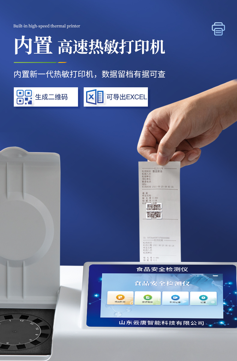 8.3、數據監管系統:同步對接監管平臺,數據可局域網和互聯網數據上傳,檢測結果可選擇直接傳至食品安全監管平臺。進行區域食品安全監管及大數據分析處理與數據統計,檢測區域食品安全長短期動態,達到食品安全問題預估、預警。8.4、打印系統:內置全新打印機,可以打?。喉椖棵Q,二維碼,抽樣信息、檢測信息,受檢信息、復核信息、抽樣日期、檢測日期等信息的打印。