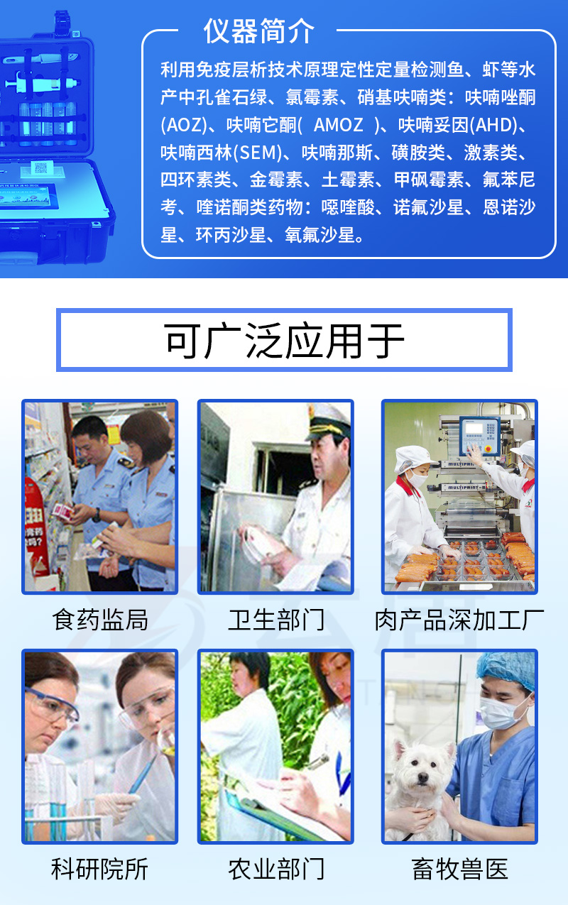 該儀器廣泛應(yīng)用于食藥監(jiān)局、衛(wèi)生監(jiān)督部門、農(nóng)業(yè)部門、商業(yè)系統(tǒng)養(yǎng)殖場(chǎng)、屠宰場(chǎng)、食品肉產(chǎn)品深加工企業(yè)、畜牧獸醫(yī)、檢驗(yàn)檢疫部門、食品生產(chǎn)企業(yè)、農(nóng)副產(chǎn)品批發(fā)市場(chǎng)、農(nóng)業(yè)生產(chǎn)基地、超市、餐廳、高教院校、食堂等單位部門對(duì)食品中的不安全指標(biāo)進(jìn)行監(jiān)測(cè)使用。