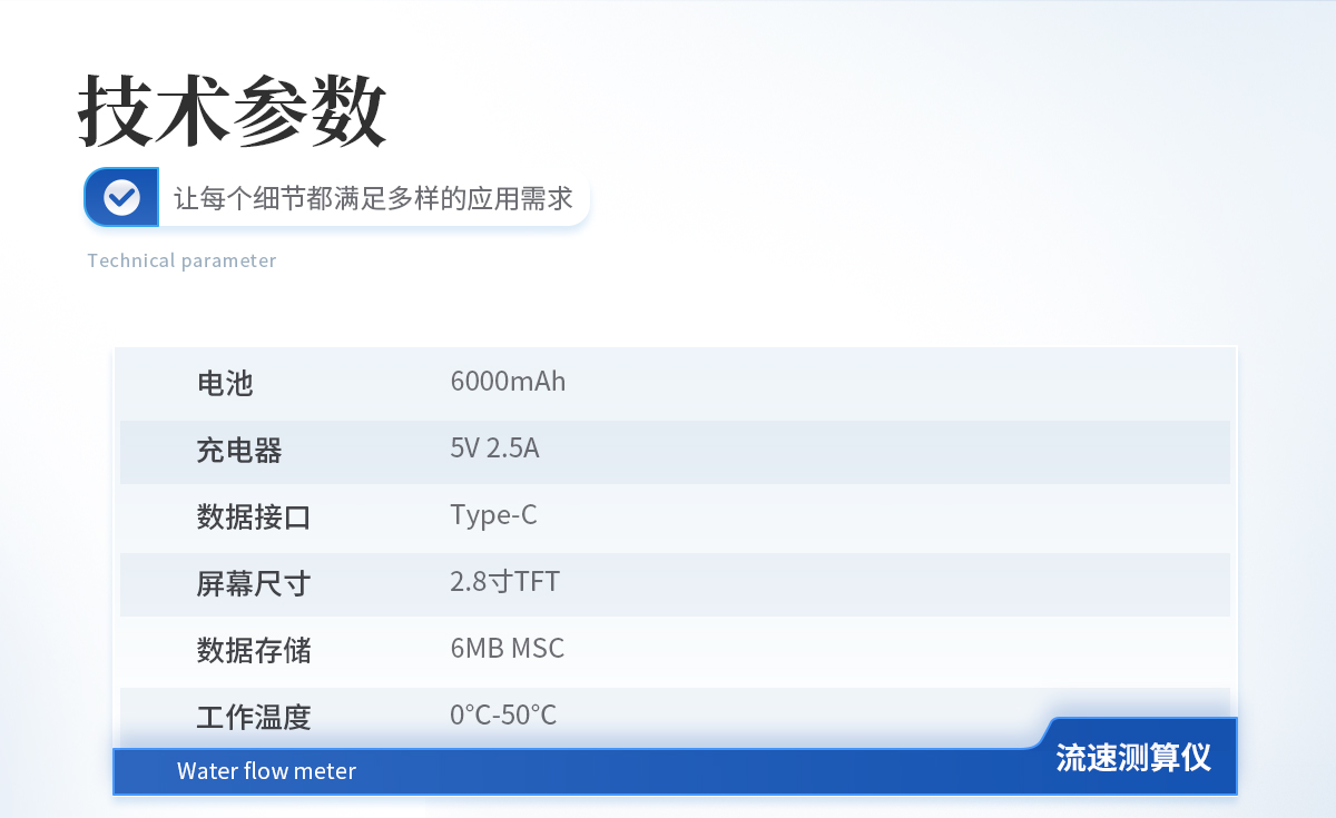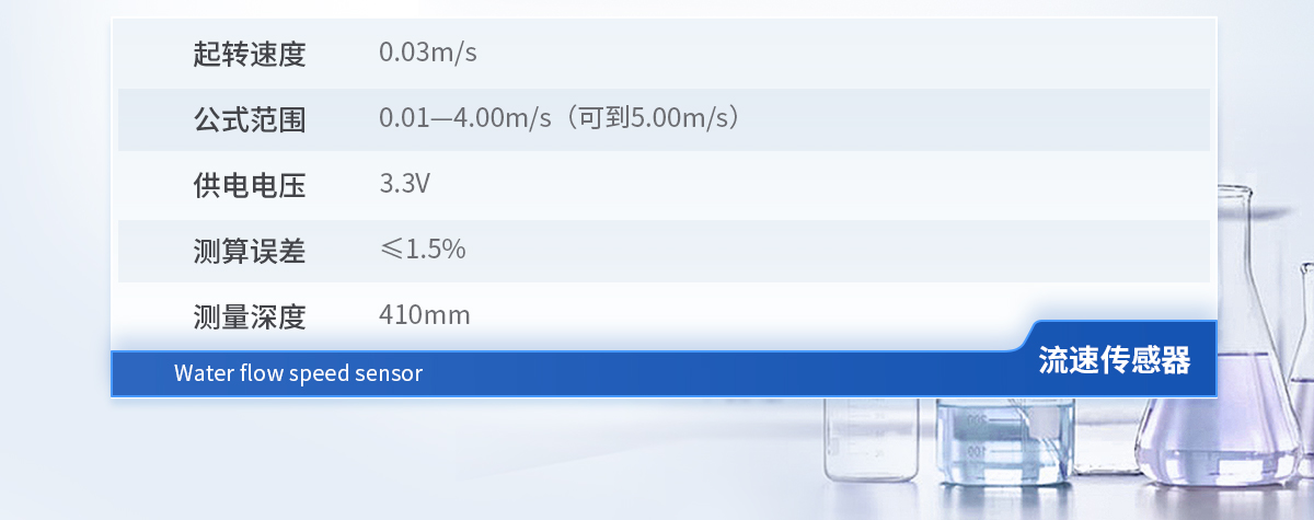 起轉速度 :0.03m/s 公式范圍 :0.01—4.00m/s(可到5.00m/s) 供電電壓:3.3V 測算誤差 :≤1.5% 測量深度 :410mm