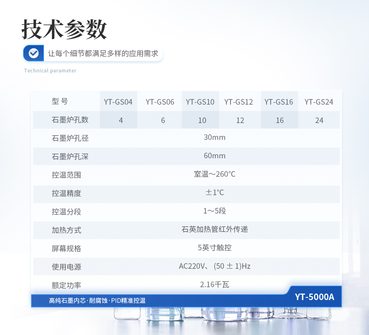 石墨爐孔:孔徑30mm,孔深60mm,孔數(shù)2×2 控溫范圍:室溫~260℃ 控溫精度:±1℃ 控溫分段:1~5段 加熱方式:石英加熱管紅外傳遞 屏幕規(guī)格:5寸觸控 主機(jī)外型尺寸:寬387mm×深371mm×高168mm 使用電源:AC220V、 (50 ± 1)Hz 額定功率:1千瓦