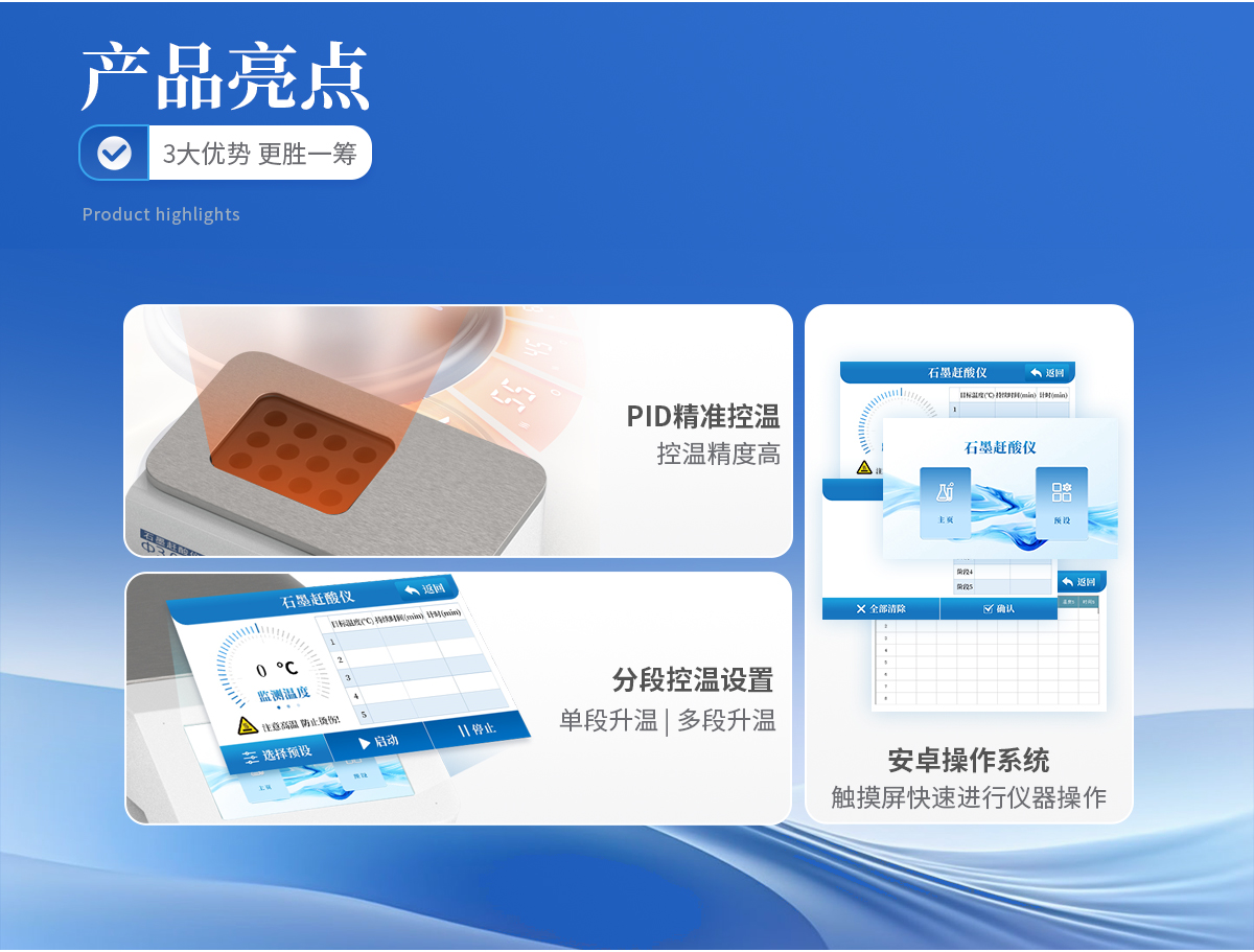使用5寸彩色觸摸屏進行儀器操作,配備安卓操作系統(tǒng),方便快捷。 采用PID 控溫技術(shù),控溫精度高,升溫速度快, 從室溫到260℃僅需25分鐘。 分段控溫設(shè)置,即可單段升溫,也可多段升溫,設(shè)置靈活,儀器將自動按順序完成。更適于易產(chǎn)生泡沫的樣品。 采用優(yōu)質(zhì)石墨爐內(nèi)芯,平均溫差較小,樣品效果一致性好,熱傳導(dǎo)效率更高。石墨塊具有特氟龍涂層,耐腐蝕,延長使用壽命。