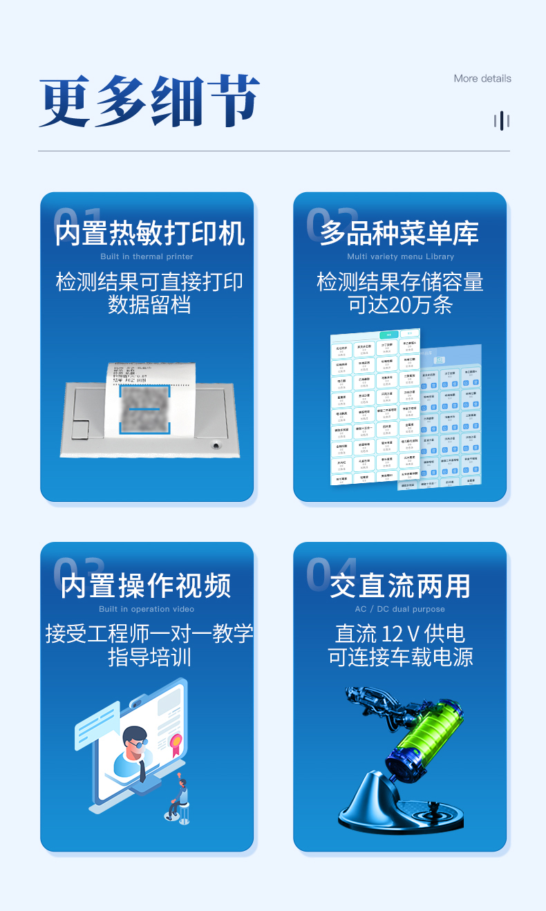 | 1、儀器采用臺式一體化系統檢測技術,將分光光度模塊、數字化管理模塊、無線通訊模塊高度集成于一體,支持檢測幾十種食品安全檢測項目,同時預留升級檢測方法。 | 2、儀器檢測模塊標準化、智能化,檢測項目可隨意自由組合。檢測箱體內置多個標準檢測單元,檢測模塊可以調整配置。 | 3、顯示屏幕:儀器采用7英寸液晶觸摸屏,搭配運行安卓智能操作系統,主控芯片采用ARM Cortex-A7,RK3288/4核處理器,主頻1.88Ghz,操作方便,性能更強。 | 4、檢測通道:≥12通道;采用精密旋轉比色池設計,使用同芯片同光源校準精度,解決不同光源之間的誤差值,更加準確**。 | 5、儀器光源:高精度進口四波長冷光源,每個通道均配置 410、520、590、630nm 波長光源,標配**的光路切換裝置,專利光路切換功能可實現64波長,并且所有檢測項目可實現所有通道同時檢測。 | 6、通訊接口:配備無線通信模塊、可選配4G(APN)通訊模塊和藍牙傳輸,同時具有USB接口,可以多方式實現數據保存及數據傳輸。 | 7、存儲方式:支持U盤存儲,標準USB接口,免驅動安裝。檢測結果存儲容量20萬條以上,可生成Excel表格進行拷貝,并具有登錄保護功能。 | 8、智能化操作系統 | 8.1、操作系統:儀器可在同一檢測界面自動對應相關檢測通道,一次性選擇1-12個樣品名稱,無需退出界面,節省操作時間。并可以對每個通道屬性和樣品信息單獨進行編輯,例如送檢單位、人員,檢測人員等,打印時勾選打印顯示。 | 8.2、限量規判系統:具有限量查詢、添加物質合規判定系統。檢測出結果后,系統自動調用系統數據庫中相關國標進行比對判定,客觀顯示結果是否合格。 | 8.3、數據監管系統:同步對接監管平臺,數據可局域網和互聯網數據上傳,檢測結果可選擇直接傳至食品安全監管平臺。進行區域食品安全監管及大數據分析處理與數據統計,檢測區域食品安全長短期動態,達到食品安全問題預估、預警。 | 8.4、打印系統:內置全新打印機,可以打印:項目名稱,二維碼,抽樣信息、檢測信息,受檢信息、復核信息、抽樣日期、檢測日期等信息的打印。 | 9、供電模式:儀器交直流兩用,直流12V供電(標配),可連接車載電源,亦可選配6ah大容量充電鋰電池,電量可實時顯示,方便戶外流動測試。 | 10、儀器具有重新校準、鎖定、恢復出廠設置功能, | 11、外觀尺寸:415X310X150(mm) ,并可加配鋁合金手提箱 |