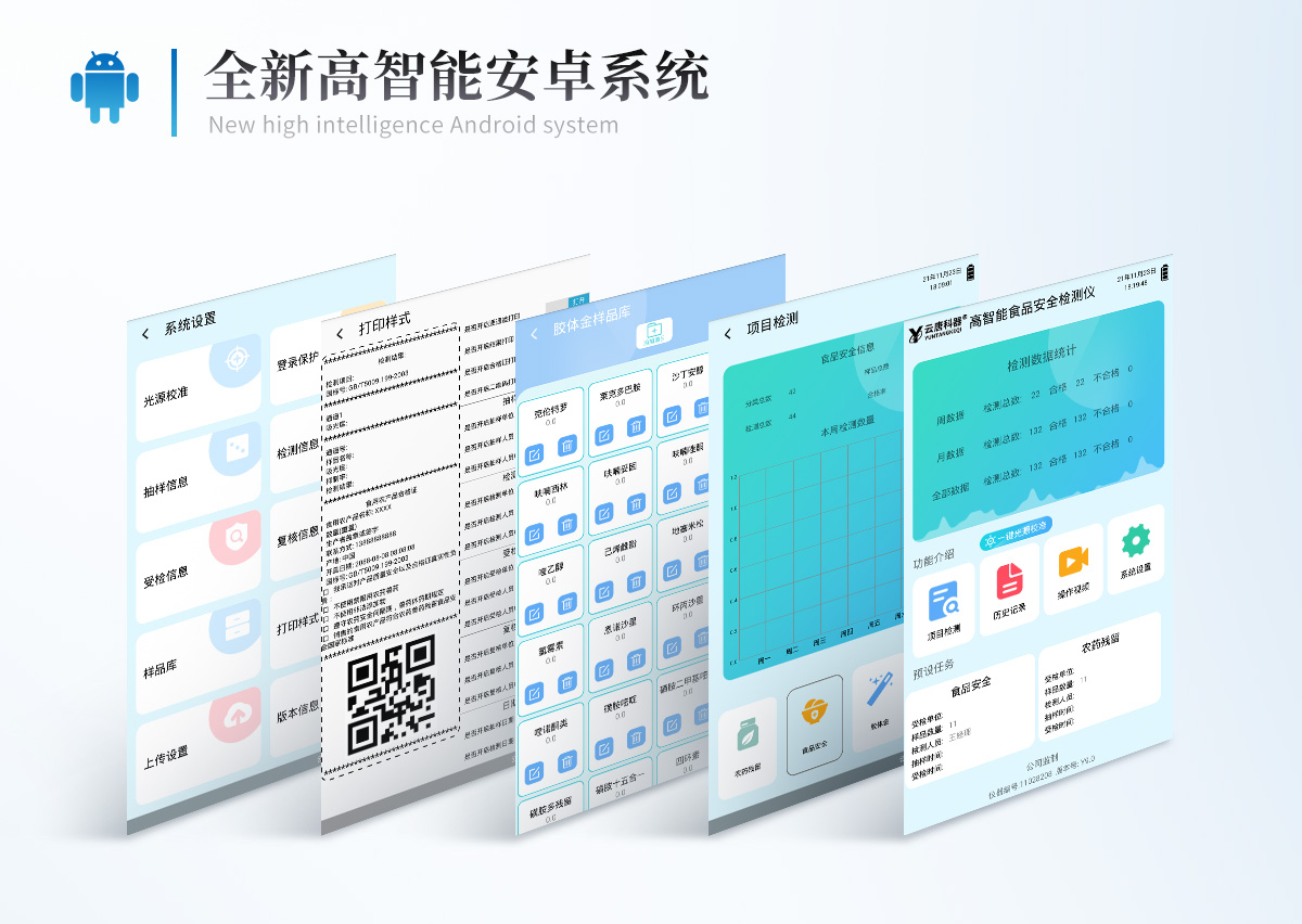 | 儀器采用手提式一體化系統檢測技術,將分光光度模塊、膠體金檢測模塊、新型農殘檢測模塊、數字化管理模塊、無線通訊模塊高度集成于一體,支持檢測200種食品安全檢測項目,同時預留升級檢測方法。 | 儀器檢測模塊標準化、智能化,檢測項目可隨意自由組合。檢測箱體內置多個標準檢測單元,檢測模塊可以調整配置。 | 顯示屏幕:儀器采用10.1英寸豎向液晶觸摸屏顯,搭配運行安卓智能操作系統,主控芯片采用ARM Cortex-A7,RK3288/4核處理器,主頻1.88Ghz,操作方便,性能更強。 | 檢測通道:≥12通道;采用精密旋轉比色池設計,使用同芯片同光源校準精度,解決不同光源之間的誤差值,更加準確**。(1-12通道間誤差0.1%,***:**202022821055.2) | 儀器光源:高精度進口四波長冷光源,每個通道均配置 410、520、590、630nm 波長光源,標配**的光路切換裝置,專利光路切換功能可實現64波長,并且所有檢測項目可實現所有通道同時檢測。 | 設備可一鍵校準,自動保存校準數據,自動對比校驗,得到精準光源,采用Android SP存儲數據,光源數據永不丟失,方便每一次使用。 | 通訊接口:配備無線通信模塊、4G(APN)通訊模塊、藍牙傳輸,同時具有雙USB接口以及RJ45網線接口,可以多方式實現數據保存及數據傳輸。 | 存儲方式:支持U盤存儲,標準USB接口,免驅動安裝。檢測結果存儲容量20萬條以上,可生成Excel表格進行拷貝,并具有登錄保護功能。 | 智能化操作系統:: ★操作系統:儀器可在同一檢測界面自動對應相關檢測通道,一次性選擇1-12個樣品名稱,無需退出界面,節省操作時間。并可以對每個通道屬性和樣品信息單獨進行編輯,例如送檢單位、人員,檢測人員等,打印時勾選打印顯示。 | ★數據集成系統:設備首頁自動匯總分析檢測數據,包含:周檢測數據、月檢測數據,全部檢測總數量,均包含檢測總數,合格數,不合格數,以及相關柱形分析圖,各項檢測數據一目了然,無需電腦查詢,更加快捷直觀。 | ★數據庫系統:十幾項數據庫分類管理儀器:包含項目類型、項目數據、檢測數據、歷史記錄、國標信息、曲線信息、采樣信息、檢測信息、受檢信息、復核信息、圖表信息、光源校準信息、打印樣式信息、樣品庫信息等等,數據庫之間互相協調聯動保證數據的真實完整性。同時產品數據庫以及歷史檢測記錄支持一鍵檢索功能。 | ★限量規判系統:具有限量查詢、添加物質合規判定系統。檢測出結果后,系統自動調用系統數據庫中相關國標進行比對判定,客觀顯示判定結果是否合格 | ★項目預設系統:儀器具有任務預設模塊,一鍵提前預設,給出方便快捷的新檢測方案,每一個任務分別可以設置不同的樣品、批次、編號、來源、備注、抽樣信息、檢測信息、受檢信息、復核信息等更多信息。樣品送檢時一鍵調取保存信息,并可多次調取,大大提高檢測效率。 | ★數據監管系統:同步對接監管平臺,數據可局域網和互聯網數據上傳,檢測結果可選擇直接傳至食品安全監管平臺。進行區域食品安全監管及大數據分析處理與數據統計,檢測區域食品安全長短期動態,達到食品安全問題預估、預警。 | ★打印系統:內置全新打印機,新創自定義打印方式,可按需靈活勾選控制:產品合格證(國家農業部標準要求),二維碼,抽樣信息、檢測信息,受檢信息、復核信息、抽樣日期、檢測日期等信息的打印。 | 供電模式:儀器交直流兩用,直流12V供電,可連接車載電源,可配6ah大容量充電鋰電池,電量可實時顯示,方便戶外流動測試。 | 膠體金檢測模塊:采用雙通道CMOS成像處理技術及膠體金免疫層析技術,可同時讀取雙膠體金卡數據,自動采集、處理分析,將檢測結果顯示,并可根據參考限值自動判斷檢測結果,可檢測常見的獸藥殘留、生物毒素、抗生素、違禁添加物等。 | ★探測技術:CMOS成像探測; | ★檢測通道:1個通道; | ★檢測方式:消線法和比色法; | ★顯示模式:陰性或陽性; | ★曲線形式:軌道式掃描方式,顯示金標卡圖像,實時生成、識別CT曲線圖,無需手動調整,完成檢測后自動退出檢測卡。兼容市場上其他金標卡,使用耗材不受限制。 | 儀器加入遠程升級功能,可定向分客戶分儀器更新,開機后自動更新,客戶無需任何操作,即可升級全新項目。做到了無需退換機器即可實現實時遠程升級檢測儀器。 |