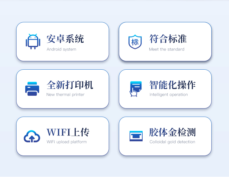 | 安卓智能操作系統,采用更加**和人性化操作,儀器具有wifi聯網上傳、4G聯網傳輸、GPRS無線遠傳、網線連接功能,快速上傳數據。 | 智能化程度高,儀器具有自檢功能:具有開機自檢和調零功能,具有自動檢測重復性功能。 | 新一代高速熱敏打印機,檢測完成可自動打印檢測報告和二維碼。 | 儀器帶有監管平臺,數據可局域網和互聯網數據上傳,檢測結果直接傳至食品安全監管平臺。進行區域食品安全監管及大數據分析處理與數據統計,檢測區域食品安全長短期動態,達到食品安全問題預估、預警 | 一體化便攜式快檢設備,滿足現場及流動檢測使用需求,能夠在同一軟件下實現所有檢測項目的檢測,并可通過同一窗口直觀顯示檢測結果。 | 膠體金模塊檢測方式:軌道式自動傳輸掃描,檢測完成后自動退出檢測卡。 | 儀器內置攝像頭拍照,可顯示金標卡實時圖像,系統自動分析并呈現出CT曲線圖,CT線自動識別,無需手動調整。 | 儀器具有品類多種類樣品菜單庫,可靈活選擇檢測樣品,不同的檢測通道可同時檢測不同的樣品項目。 | 樣品處理簡單省力,整體操作快速、安全、便捷。 | 高靈敏度,高檢測精度,高重復性精度,掃描式高精度光學傳感器。 | 內置強大的數據庫,可在儀器上直接選擇樣品名稱、檢測指標、送檢單位等信息,也可在儀器上直接編輯錄入樣品名稱、檢測指標、送檢單位等信息并保存進樣品數據庫。 | 儀器具有自身保護功能,可設置用戶名及密碼,防止非工作人員操作等。 | 儀器具有重新校準、鎖定、恢復出廠設置功能。 | 結果判定線可修改,對照值標定值可保存,斷電不丟失數據。 | 兼容市場上所有的膠體金卡,使用耗材不受限制,極大增強用戶使用體驗。 |