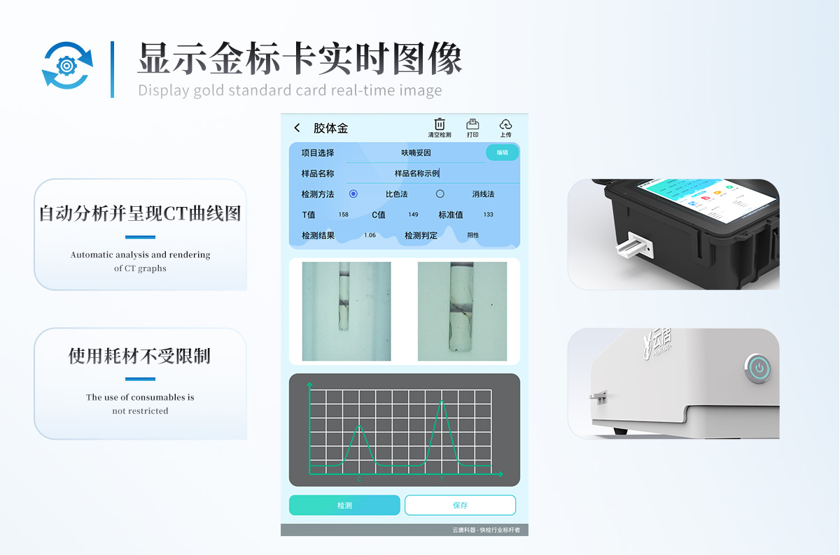 | 儀器采用10.1英寸液晶觸摸屏顯,搭配運行安卓智能操作系統,主控芯片采用ARM Cortex-A7,RK3288/4核處理器,主頻1.88Ghz,運轉速度更快速,性能更強。 | 儀器功能包括:膠體金檢測模塊、數字化管理模塊、無線通訊模塊等,可以滿足同一軟件下實現所有檢測項目的檢測,并在同一窗口展示檢測結果。 | 一體化臺式快檢設備,采用交直流兩用供電方式,可連接車載電源,配備6ah大容量充電鋰電池,可以滿足現場及流動檢測使用的需求。儀器尺寸:43×35×20cm, 主機凈重:5.1kg | 系統自帶數據集成模塊,設備首頁自動統計檢測數據包含:周檢測數據、月檢測數據,全部檢測總數量,均包含檢測總數,合格數,不合格數,以及相關柱形分析圖,對各項檢測數據清晰掌握,無需電腦查詢,更加快捷直觀。 | 儀器具有任務預設模塊,可在樣品送檢前提前預設樣品名稱、檢測指標、送檢單位等信息,樣品送檢時一鍵調取保存信息,檢測更加方便快捷。 | 直插式自動掃描方式,可實時顯示金標卡實時圖像,系統自動分析并呈現出CT曲線圖,CT線自動識別,無需手動調整,完成檢測后自動退出檢測卡。 | 膠體金模塊檢測方式:軌道式自動傳輸掃描,檢測完成后自動退出檢測卡。 | 儀器檢測系統擁有龐大數據庫,并且構建了完善的檢索、修訂功能。食品庫涵蓋多種樣品名稱,可按需添加或刪除、編輯樣品名稱;產品數據庫以及歷史檢測記錄支持一鍵檢索功能。 | 系統打印自定義化,打印格式多樣化,產品合格證(國家標準要求),二維碼,抽樣信息、檢測信息,受檢信息、復核信息、抽樣日期、檢測日期等信息結果,可按需求自行設置打印內容。 | A4紙版本報告打印功能(可選配):設備擁有兩種結果展示方式,可以自動生成A4打印模板和小票打印模板兩種樣式,可通過WiFi及網線等方式鏈接外置打印機可進行打印 | 儀器具有 wifi 聯網上傳、RJ45網線連接功能,可以快速上傳數據。同步對接監管平臺,數據可局域網和互聯網數據上傳,檢測結果直接傳至食品安全監管平臺。進行區域食品安全監管及大數據分析處理與數據統計,檢測區域食品安全長短期動態,達到食品安全問題預估、預警。 | 設備支持U盤存儲,標準USB接口,免驅動安裝。檢測結果存儲容量20萬條以上,可生成Excel表格,進行一鍵拷貝,并具有登錄保護功能,可設置用戶名及密碼,規范不同人員操作權限,防止非工作人員操作,并且可以進行重新校準、鎖定、恢復出廠設置功能。儀器固件可升級,后期檢測項目可擴充。 | 儀器具備遠程升級功能,可定向分客戶分儀器更新,開機后自動更新,并可持續性免費更新系統版本,無需像傳統產品返廠更新,節省時間及人力成本并避免了物流運輸返廠升級導致設備損壞的潛在風險。 |