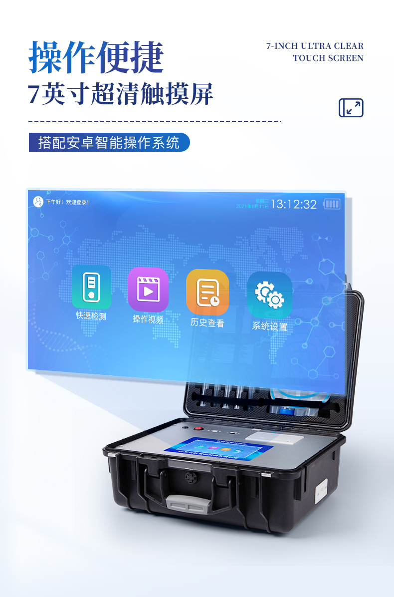 | 主控芯片采用ARM Cortex-A7,RK3288/4核處理器,主頻1.88Ghz,運轉速度更快速,穩定性更強。 | 顯示方式:7英寸液晶觸摸屏顯示,人性化中文操作界面,讀數直觀、簡單。 | 交直流兩用,直流12V供電,可連接車載電源,可配6ah大容量充電鋰電池,方便戶外流動測試。 | 四波長冷光源,每個通道均配置410、520、590、630nm波長光源,標配**的光路切換裝置,專利光路切換功能可實現*多64波長,并且所有檢測項目可實現所有通道同時檢測。 | 光源亮度自動調節與校準 | 智能恒流穩壓,光強自動校準,長時間連續工作光源無溫漂現象。 | 內置新國家限量標準,與所測結果進行現場比對,并持續更新標準。 | 不間斷進樣,連續檢測 | 樣本編號自動累加。 | 數據無線上傳平臺,并可從平臺導出為Excel表格。 | 檢測結果存儲容量20萬條 | 同時支持U盤拷貝,標準USB接口,免驅動插拔。 | 檢測項目可擴充,固件可升級 | 儀器尺寸:43×35×20cm, 主機凈重:5.2kg |