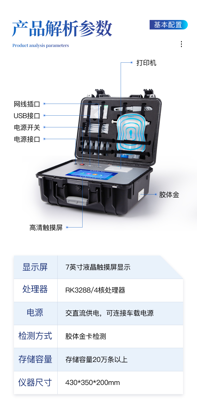| 安卓智能操作系統,采用更加**UI交互界面,儀器具有wifi聯網上傳、4G聯網傳輸、GPRS無線遠傳、網線連接功能,快速批量上傳數據。 | 智能化程度高,儀器具有自檢功能:具有開機自檢和調零功能,具有自動檢測重復性功能。 | 新一代高速熱敏打印機,檢測完成可自動打印檢測報告和二維碼。 | 儀器帶有監管平臺,數據可局域網和互聯網數據上傳,檢測結果直接傳至食品安全監管平臺。進行區域食品安全監管及大數據分析處理與數據統計,檢測區域食品安全長短期動態,達到食品安全問題預估、預警 | 一體化便攜式快檢設備,滿足現場及流動檢測使用需求,能夠在同一軟件下實現所有檢測項目的檢測,并可通過同一窗口直觀顯示檢測結果。 | 膠體金模塊檢測方式:軌道式自動傳輸掃描,檢測完成后自動退出檢測卡。 | 一體化主機,包含食品安全檢測模塊、多通道農藥殘留檢測模塊、膠體金免疫層析檢測模塊。 | CT線自動識別,無需手動調整。 | 儀器具有品類多種類樣品菜單庫,可靈活選擇檢測樣品,不同的檢測通道可同時檢測不同的樣品項目。。 | 樣品處理簡單省力,整體操作快速、安全、便捷。 | 儀器具有自身保護功能,可設置用戶名及密碼,防止非工作人員操作等。 | 高靈敏度,高檢測精度,高重復性精度,掃描式高精度光學傳感器。 | 儀器具有重新校準、鎖定、恢復出廠設置功能。 | 內置強大的數據庫,可在儀器上直接選擇樣品名稱、檢測指標、送檢單位等信息,也可在儀器上直接編輯錄入樣品名稱、檢測指標、送檢單位等信息并保存進樣品數據庫。 | 儀器具有重新校準、鎖定、恢復出廠設置功能。 | 結果判定線可修改,對照值標定值可保存,斷電不丟失數據。 | 兼容市場上所有的膠體金卡,使用耗材不受限制,極大增強用戶使用體驗。 |