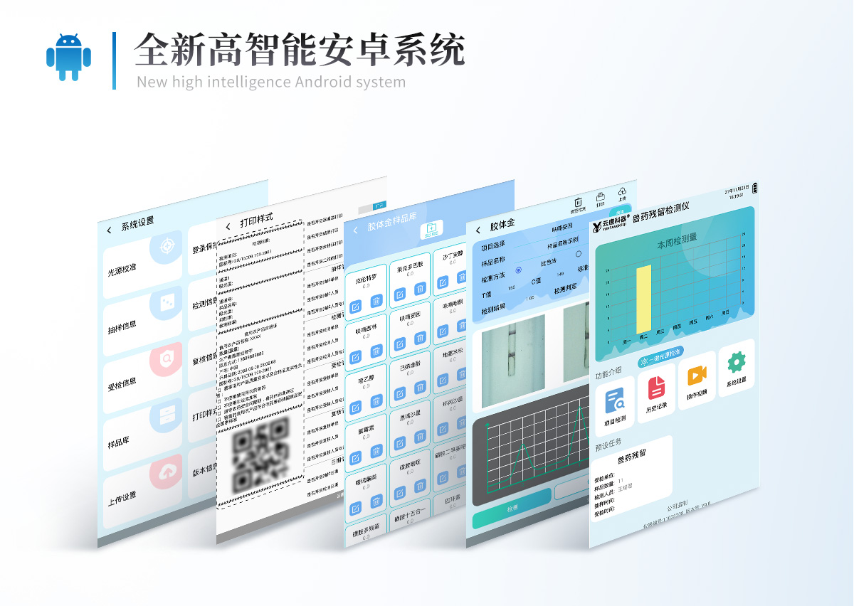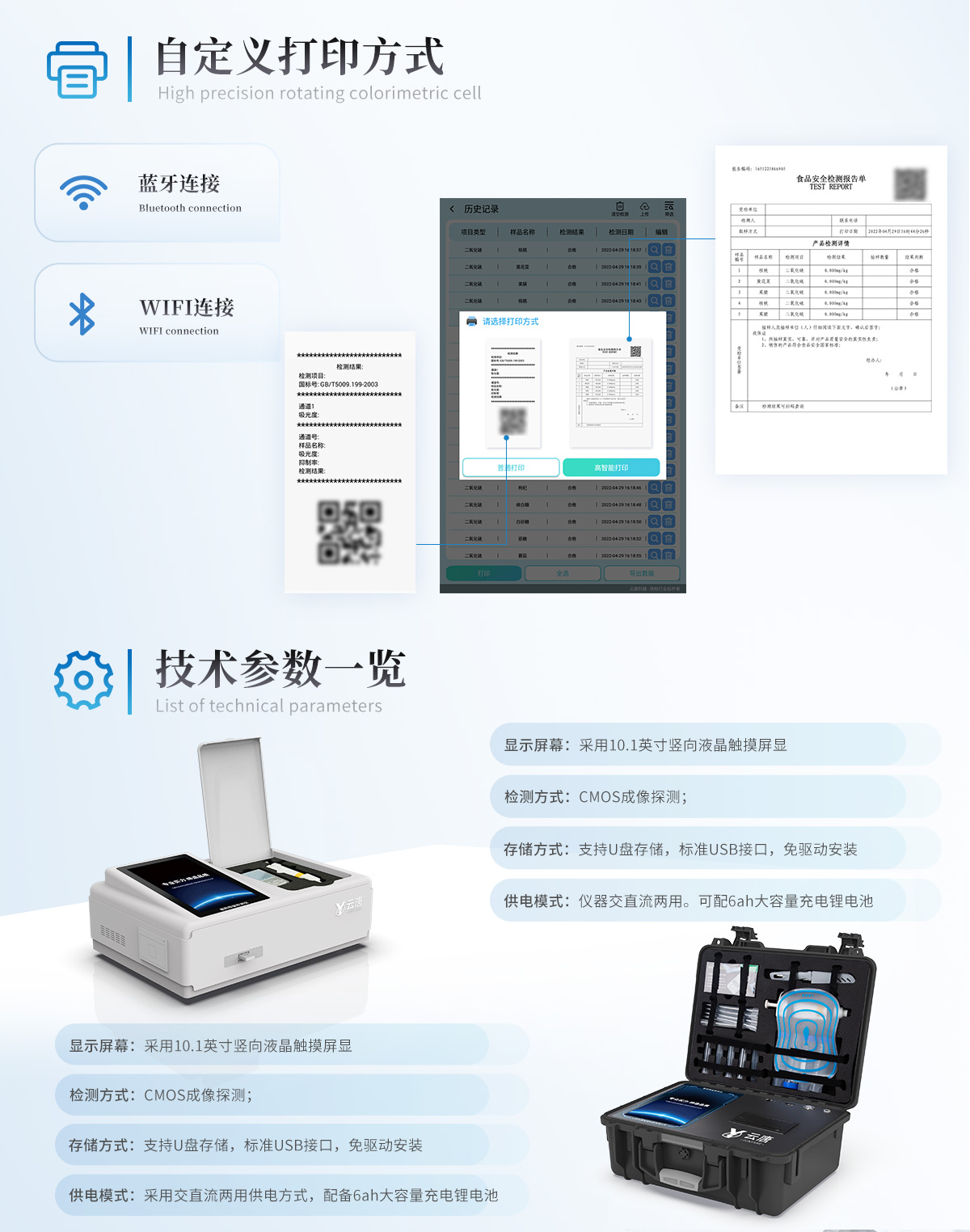 | 儀器采用10.1英寸液晶觸摸屏顯,搭配運行安卓智能操作系統,主控芯片采用ARM Cortex-A7,RK3288/4核處理器,主頻1.88Ghz,運轉速度更快速,性能更強。 | 儀器功能包括:膠體金檢測模塊、數字化管理模塊、無線通訊模塊等,可以滿足同一軟件下實現所有檢測項目的檢測,并在同一窗口展示檢測結果。 | 一體化便攜式快檢設備,采用交直流兩用供電方式,可連接車載電源,配備6ah大容量充電鋰電池,可以滿足現場及流動檢測使用的需求。儀器尺寸:43×35×20cm, 主機凈重:5.1kg | 系統自帶數據集成模塊,設備首頁自動統計檢測數據包含:周檢測數據、月檢測數據,全部檢測總數量,均包含檢測總數,合格數,不合格數,以及相關柱形分析圖,對各項檢測數據清晰掌握,無需電腦查詢,更加快捷直觀。 | 儀器具有任務預設模塊,可在樣品送檢前提前預設樣品名稱、檢測指標、送檢單位等信息,樣品送檢時一鍵調取保存信息,檢測更加方便快捷。 | 軌道式自動傳輸掃描方式,可實時顯示金標卡實時圖像,系統自動分析并呈現出CT曲線圖,CT線自動識別,無需手動調整,完成檢測后自動退出檢測卡。 | 結果判定線可修改,對照值標定值可保存,斷電不丟失數據。 | 兼容市場上其他膠體金卡,使用耗材不受限制,極大增強用戶使用體驗。 | 儀器檢測系統擁有龐大數據庫,并且構建了完善的檢索、修訂功能。食品庫涵蓋多種樣品名稱,可按需添加或刪除、編輯樣品名稱;產品數據庫以及歷史檢測記錄支持一鍵檢索功能。 | 系統打印自定義化,打印格式多樣化,產品合格證(國家標準要求),二維碼,抽樣信息、檢測信息,受檢信息、復核信息、抽樣日期、檢測日期等信息結果,可按需求自行設置打印內容。 | A4紙版本報告打印功能(可選配):設備擁有兩種結果展示方式,可以自動生成A4打印模板和小票打印模板兩種樣式,可通過WiFi及網線等方式鏈接外置打印機可進行打印 | 儀器具有 wifi 聯網上傳、RJ45網線連接功能,可以快速上傳數據。同步對接監管平臺,數據可局域網和互聯網數據上傳,檢測結果直接傳至食品安全監管平臺。進行區域食品安全監管及大數據分析處理與數據統計,檢測區域食品安全長短期動態,達到食品安全問題預估、預警。 | 設備支持U盤存儲,標準USB接口,免驅動安裝。檢測結果存儲容量20萬條以上,可生成Excel表格,進行一鍵拷貝,并具有登錄保護功能,可設置用戶名及密碼,規范不同人員操作權限,防止非工作人員操作,并且可以進行重新校準、鎖定、恢復出廠設置功能。儀器固件可升級,后期檢測項目可擴充。 | 儀器具備遠程升級功能,可定向分客戶分儀器更新,開機后自動更新,并可持續性免費更新系統版本,無需像傳統產品返廠更新,節省時間及人力成本并避免了物流運輸返廠升級導致設備損壞的潛在風險。 |