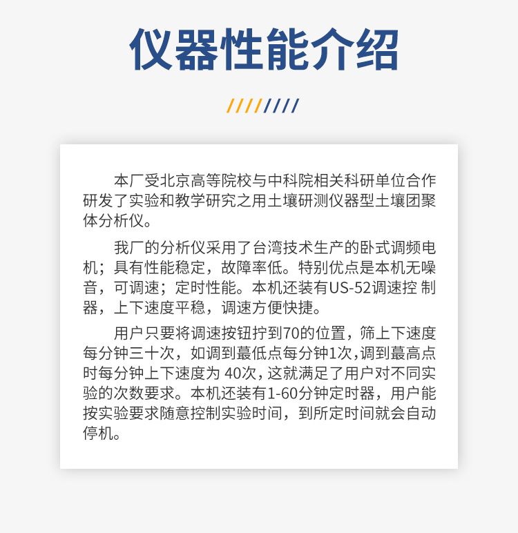 本廠受北京高等院校與中科院相關(guān)科研單位合作研發(fā)了實(shí)驗(yàn)和教學(xué)研究之用土壤研測(cè)儀器(YT-TRTL)型土壤團(tuán)聚體分析儀。我廠的分析儀采用了臺(tái)灣技術(shù)生產(chǎn)的臥式調(diào)頻電機(jī);具有性能穩(wěn)定,故障率低。特別優(yōu)點(diǎn)是本機(jī)無噪音,可調(diào)速;定時(shí)性能。本機(jī)還裝有US-52調(diào)速控 制器,上下速度平穩(wěn),調(diào)速方便快捷。用戶只要將調(diào)速按鈕擰到70的位置,篩上下速度每分鐘三十次,如調(diào)到**點(diǎn)每分鐘1次,調(diào)到**點(diǎn)時(shí)每分鐘上下速度為 40次,這就瞞足了用戶對(duì)不同實(shí)驗(yàn)的次數(shù)要求。本機(jī)還裝有1-60分鐘定時(shí)器,用戶能按實(shí)驗(yàn)要求隨意控制實(shí)驗(yàn)時(shí)間,到所定時(shí)間就會(huì)自動(dòng)停機(jī)。