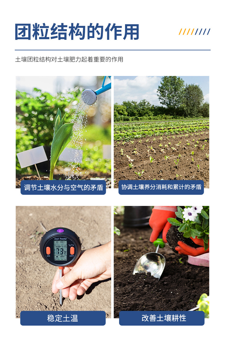 土壤團(tuán)粒結(jié)構(gòu)對(duì)土壤肥力起著重要的作用。良好的團(tuán)粒結(jié)構(gòu)一般應(yīng)具備三方面的性質(zhì):具有一定的大小,過大或過小都對(duì)形成適當(dāng)空隙比例不利:具有多級(jí)空隙,大空隙可通氣透水,小空隙保水保肥;具有一定的穩(wěn)定性,即水穩(wěn)性、機(jī)械穩(wěn)性和生物學(xué)穩(wěn)定性。良好的團(tuán)粒結(jié)構(gòu)性肥力的基礎(chǔ),團(tuán)粒結(jié)構(gòu)與土壤土壤肥力的關(guān)系主要表現(xiàn)在以下幾個(gè)方面:調(diào)節(jié)土壤水分與空氣的矛盾;協(xié)調(diào)土壤養(yǎng)分的消耗和積累的矛盾;穩(wěn)定土溫;改善土壤耕性,有利于作物根系伸展。