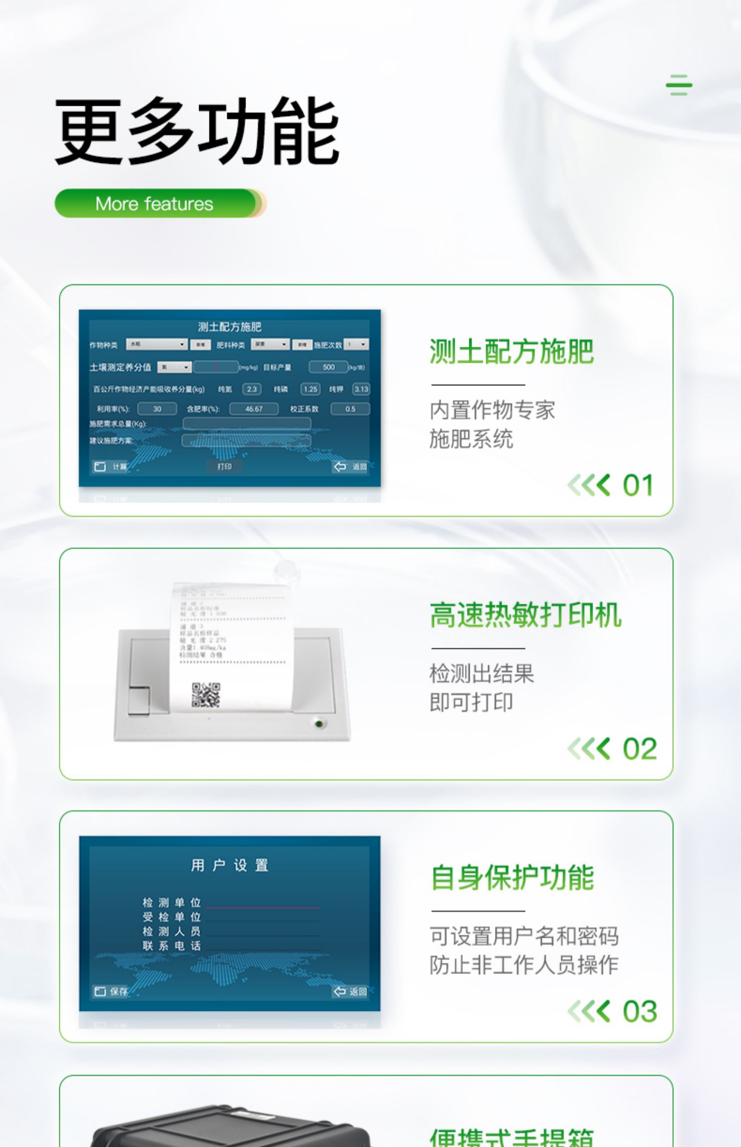 2、可檢測(cè)各種土壤、肥料、作物、食品、水質(zhì)、環(huán)境等共200多個(gè)測(cè)試項(xiàng)目,一機(jī)多用,功能齊全。