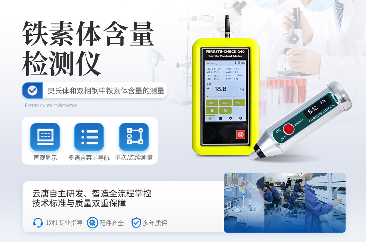 鐵素體含量檢測儀操作簡單 List-Magnetik公司 FERRITE-CHECK 140鐵素體含量檢測儀是一款設(shè)計緊湊、使用方便的便攜儀器,儀器配有集成探頭,儀器符合Basel標(biāo)準(zhǔn)DIN EN ISO 8249,使用磁感應(yīng)法測量奧氏體鋼和雙相鋼中的鐵素體含量。 高亮OLED顯示鐵素體含量 FERRITE-CHECK 140鐵素體含量檢測儀只有一個按鈕,并配有多語言菜單導(dǎo)航,非常易于使用。高亮度OLED屏顯示FN或Fe%的測量結(jié)果。 測量焊縫中的鐵素體含量 特別是對于焊接的雙相鋼,重要的是要知道焊縫是否有足夠的鐵素體含量來保證焊縫的強(qiáng)度。鐵素體含量低的話,焊縫受熱后較容易產(chǎn)生裂紋,但如果鐵素體含量過高,焊縫的韌性和延展性將會喪失。 快速連續(xù)鐵素體含量測量 使用FERRITE-CHECK 140鐵素體含量檢測儀,可以非常準(zhǔn)確和快速地測定鐵素體含量。檢測光滑或拋光表面上的焊縫時,可以將儀器切換到快速連續(xù)測量模式。當(dāng)探頭放置在表面上并沿表面移動時,測量值將連續(xù)存儲,在提起探頭后,屏幕將顯示的*小值、**值和平均值組成的統(tǒng)計信息。 校準(zhǔn)鐵素體含量檢測儀 FERRITE-CHECK 140鐵素體含量檢測儀配有3個校準(zhǔn)標(biāo)準(zhǔn)片,可追溯到NIST 管理和發(fā)送測量數(shù)據(jù)與免費(fèi)的應(yīng)用程序 為了進(jìn)一步處理測量數(shù)據(jù),您可以將FERRITE-CHECK 140鐵素體含量檢測儀與移動Android和iOS設(shè)備配對?;蛘吲c一臺Windows電腦通信。這是由低功耗藍(lán)牙技術(shù)(BLE)實現(xiàn)的。使用Lima Connect應(yīng)用程序,您可以管理項目并在照片上分配測量點(diǎn)。測量結(jié)果可以統(tǒng)計評估和圖形顯示。這款應(yīng)用適用于安卓、iOS和Windows系統(tǒng),軟件免費(fèi)的。