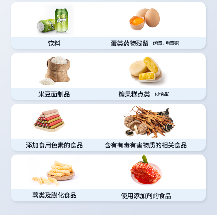 蛋類藥物殘留類:氯霉素,四環素,磺胺類,喹諾酮類,呋喃西林,呋喃它酮,呋喃妥因,呋喃唑酮,氟苯尼考,阿莫西林、頭孢氨芐、紅霉素、鏈霉素等