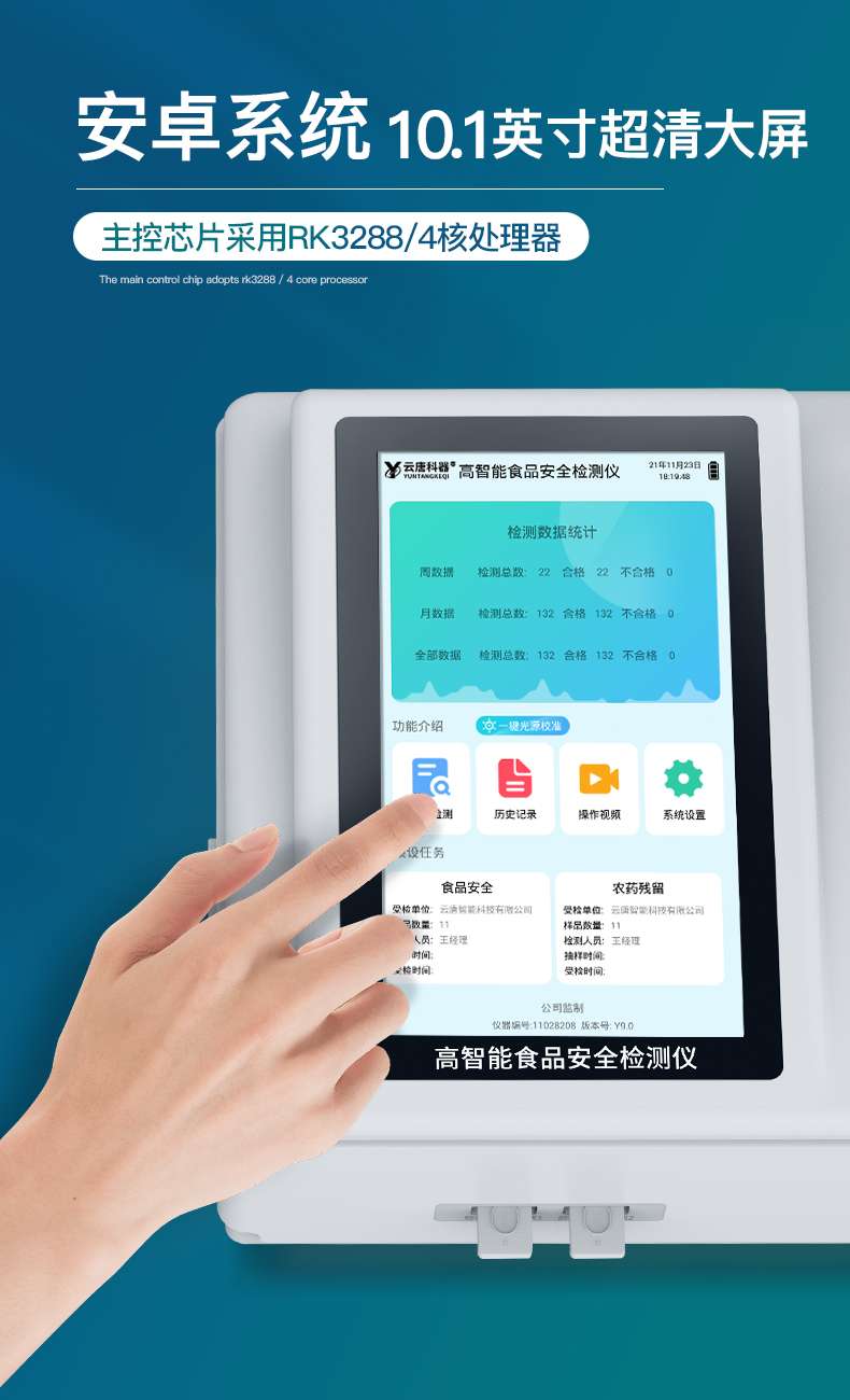 山東云唐智能科技有限公司生產的高智能食品安全檢測儀為集成化食品安全快速檢測分析設備,采用臺式一體化設計,可快速檢測200多種食品安全項目,包含非食用化學物質、濫用食品添加劑、農藥殘留、獸藥殘留、重金屬、病害肉、營養強化劑、抗生素類殘留、激素類殘留、真菌毒素類殘留、化學類殘留等項目的定性定量檢測。