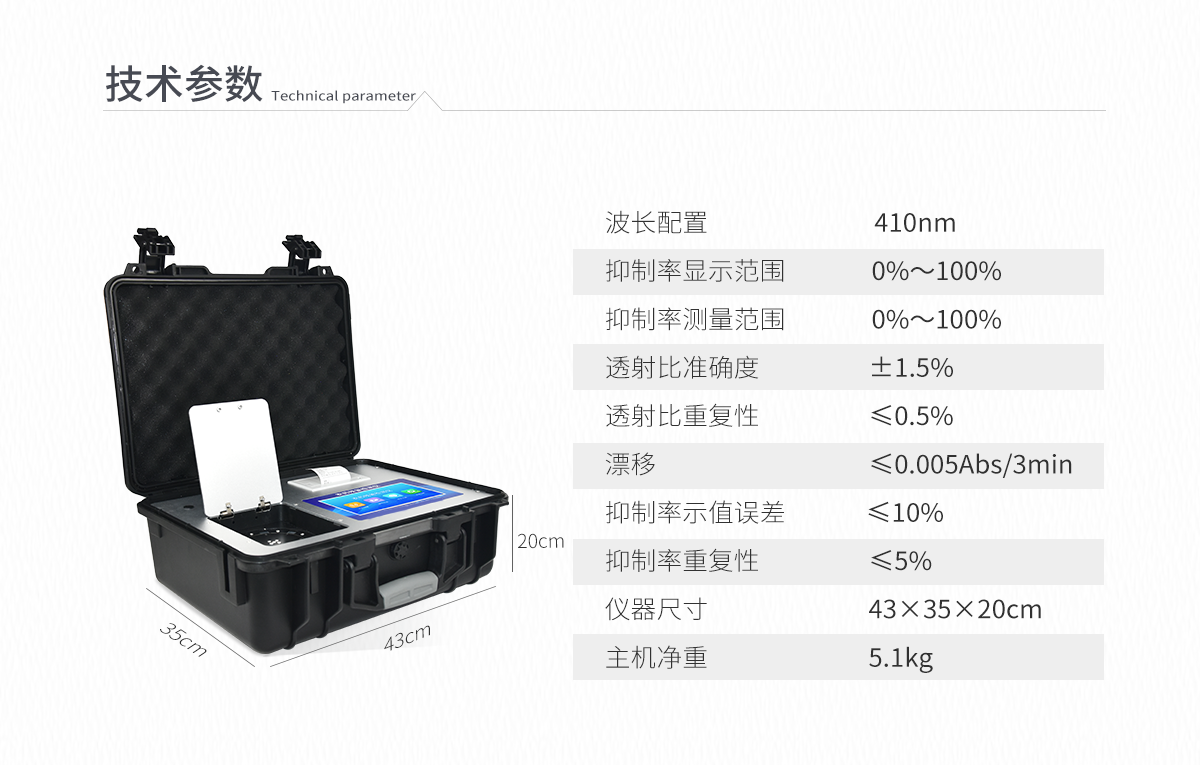 | 410nm | 0%~100% | 0%~100% | ±1.5% | ≤0.5% | ≤0.005Abs/3min | ≤10% | ≤5% | 43×35×20cm | 5.1kg |