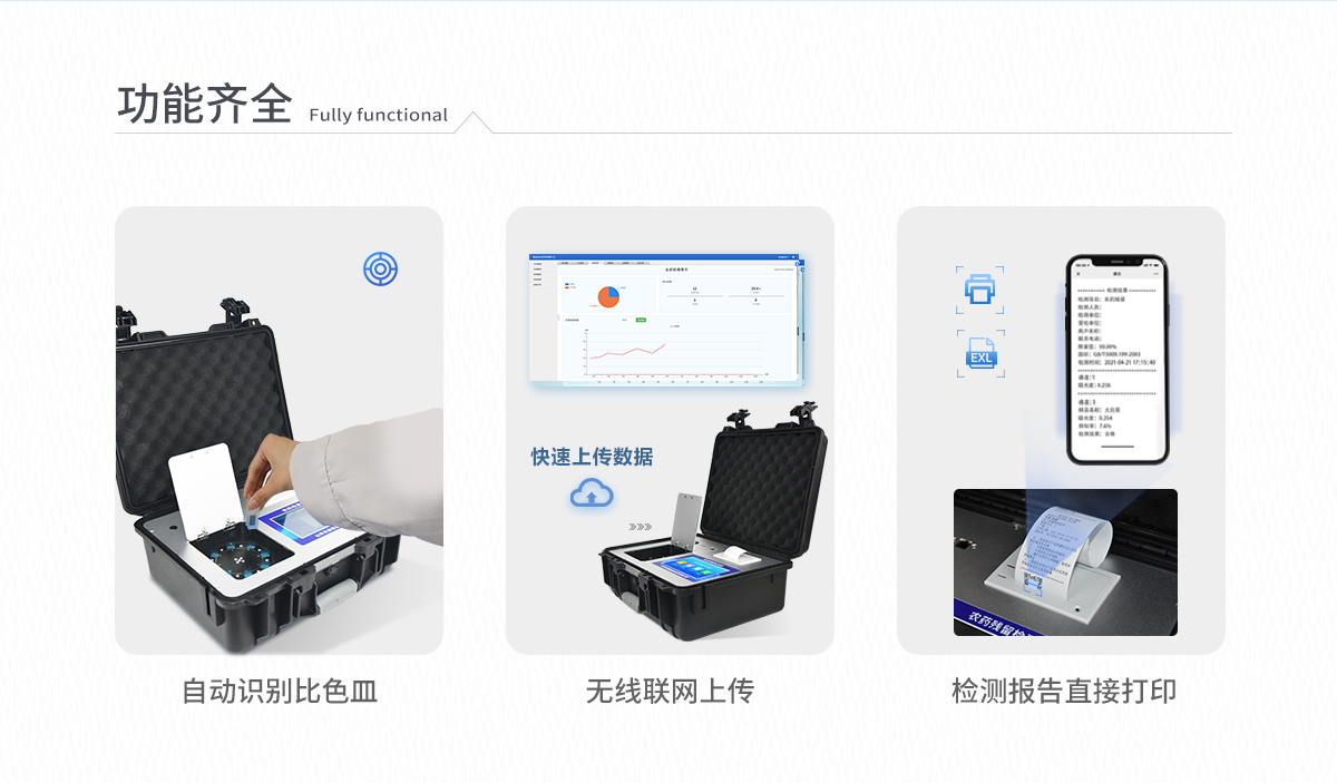 | 安卓智能操作系統(tǒng),采用更加**和人性化操作,儀器具有無(wú)線聯(lián)網(wǎng)上傳功能,快速上傳數(shù)據(jù),進(jìn)行數(shù)據(jù)統(tǒng)計(jì)和分析。 | 智能化程度高,儀器具有自檢功能:具有開機(jī)自檢和調(diào)零功能,具有自動(dòng)檢測(cè)重復(fù)性功能;同時(shí),檢測(cè)完成可自動(dòng)打印檢測(cè)報(bào)告和二維碼。手機(jī)掃碼可顯示出詳細(xì)檢測(cè)信息。 | 儀器帶有監(jiān)管平臺(tái),數(shù)據(jù)可局域網(wǎng)和互聯(lián)網(wǎng)數(shù)據(jù)上傳,檢測(cè)結(jié)果直接傳至食品安全監(jiān)管平臺(tái)。進(jìn)行區(qū)域食品安全監(jiān)管及大數(shù)據(jù)分析處理與數(shù)據(jù)統(tǒng)計(jì),檢測(cè)區(qū)域食品安全長(zhǎng)短期動(dòng)態(tài),達(dá)到食品安全問(wèn)題預(yù)估、預(yù)警 。 | 樣品處理簡(jiǎn)單省力,整體操作快速、安全、便捷。 | 儀器具有自身保護(hù)功能,可設(shè)置用戶名及密碼,防止非工作人員操作等。 | 內(nèi)置強(qiáng)大的數(shù)據(jù)庫(kù),可在儀器上直接選擇樣品名稱、檢測(cè)指標(biāo)、送檢單位等信息,也可在儀器上直接編輯錄入樣品名稱、檢測(cè)指標(biāo)、送檢單位等信息并保存進(jìn)樣品數(shù)據(jù)庫(kù),方便后期操作調(diào)取使用。 | 儀器具有重新校準(zhǔn)、鎖定、恢復(fù)出廠設(shè)置功能。 |