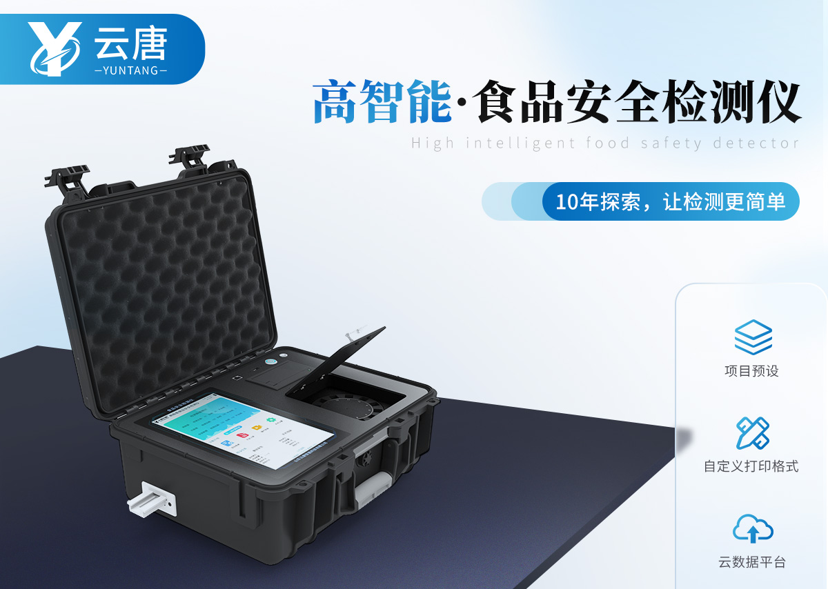 山東云唐智能科技有限公司生產(chǎn)的高智能食品安全檢測儀為集成化食品安全快速檢測分析設(shè)備,采用手提一體化設(shè)計(jì),可快速檢測200多種食品安全項(xiàng)目,包含非食用化學(xué)物質(zhì)、濫用食品添加劑、農(nóng)藥殘留、獸藥殘留、重金屬、病害肉、營養(yǎng)強(qiáng)化劑、抗生素類殘留、激素類殘留、真菌毒素類殘留、化學(xué)類殘留等項(xiàng)目的定性定量檢測。