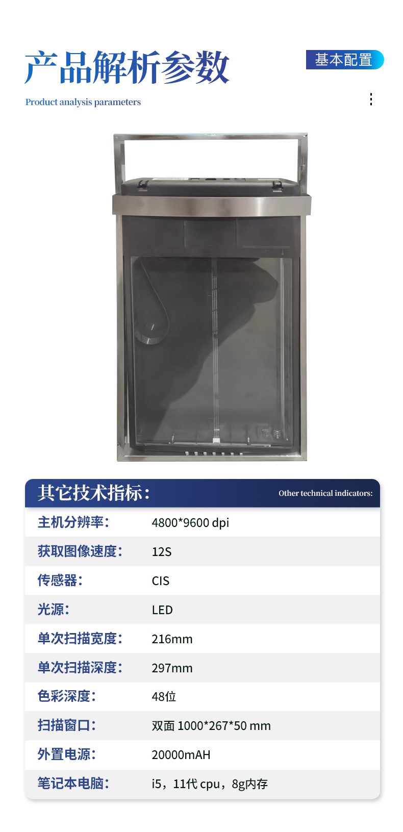 主機分辨率:4800*9600 dpi 獲取圖像速度:12S 傳感器:CIS 光源:LED 單次掃描寬度:216mm 單次掃描深度:297mm 色彩深度:48位 掃描窗口:雙面 1000*267*50 mm 外置電源:20000mAH 筆記本電腦:i5,11代 cpu,8g內存