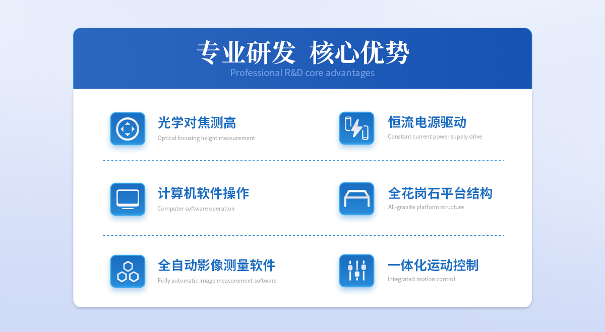 | 1、智慧燈光:鼠標單擊對應的圖標,軟件自動調節合適的燈光亮度。使用過程中方便、**。 | 2、測量宏功能:將一連串的測量構造命令關聯到一個按鈕上,點擊按鈕,即開始執行宏測量功能,宏測量功能會自動完成構造動作,減少用戶操作鼠標次數,提高工作效率。 | 3、導入CAD圖紙測量:設置跟圖紙一致的坐標系,調節好燈光,導入圖紙及完成編程步驟。對于平面尺寸測量非常**。 | 4、計算器功能:測量過程中會遇到不能直接通過測量得出的數據。軟件這里提供了一些基本表達式:絕對值、三角函數、反三角函數、平均值、**值、*小值、開平方、iF表達式等。 | 5、SPC功能:專業的 SPC 軟件,測量軟件和SPC 軟件無縫鏈接, 自動將數據導入 SPC 數據庫,其圖 表及數據可打印和導入到 EXCEL 表格 | 6、3D測量功能:需加裝選配探針或點激光 |