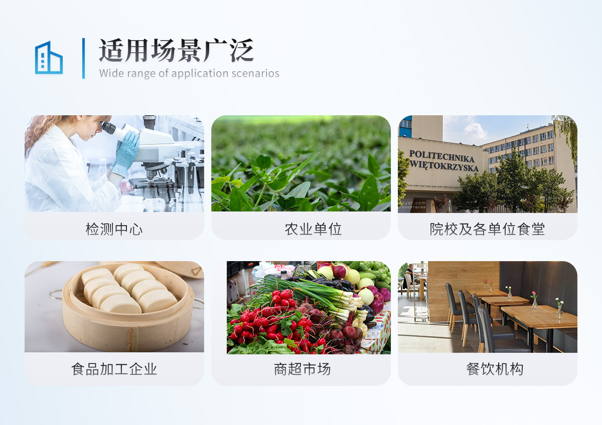 多功能食品安全檢測儀可快速檢測200多項目,包含非食用化學(xué)物質(zhì)、濫用食品添加劑、農(nóng)藥殘留、獸藥殘留、重金屬、病害肉、營養(yǎng)強化劑、抗生素類殘留、激素類殘留、真菌毒素類殘留、化學(xué)類殘留等現(xiàn)場的定性定量檢測。該多功能食品安全檢測儀為集成化食品安全快速檢測分析設(shè)備,廣泛應(yīng)用于市場監(jiān)管局、檢測中心、衛(wèi)生監(jiān)督部門、農(nóng)業(yè)部門、院校及各單位食堂、食品肉產(chǎn)品深加工企業(yè)、商超市場、司法部門、餐飲機構(gòu)、養(yǎng)殖場、屠宰場、檢驗檢疫部門等單位使用。