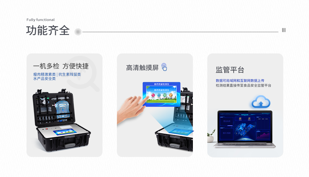 | 安卓智能操作系統,采用更加**UI交互界面,儀器具有wifi聯網上傳、4G聯網傳輸、GPRS無線遠傳、網線連接功能,快速批量上傳數據。 | 智能化程度高,儀器具有自檢功能:具有開機自檢和調零功能,具有自動檢測重復性功能。 | 新一代高速熱敏打印機,檢測完成可自動打印檢測報告和二維碼。 | 儀器帶有監管平臺,數據可局域網和互聯網數據上傳,檢測結果直接傳至食品安全監管平臺。進行區域食品安全監管及大數據分析處理與數據統計,檢測區域食品安全長短期動態,達到食品安全問題預估、預警 | 一體化便攜式快檢設備,滿足現場及流動檢測使用需求,能夠在同一軟件下實現所有檢測項目的檢測,并可通過同一窗口直觀顯示檢測結果。 | 膠體金模塊檢測方式:軌道式自動傳輸掃描,檢測完成后自動退出檢測卡。 | 一體化主機,包含食品安全檢測模塊、多通道農藥殘留檢測模塊、膠體金免疫層析檢測模塊。 | CT線自動識別,無需手動調整。 | 儀器具有品類多種類樣品菜單庫,可靈活選擇檢測樣品,不同的檢測通道可同時檢測不同的樣品項目。。 | 樣品處理簡單省力,整體操作快速、安全、便捷。 | 儀器具有自身保護功能,可設置用戶名及密碼,防止非工作人員操作等。 | 高靈敏度,高檢測精度,高重復性精度,掃描式高精度光學傳感器。 | 儀器具有重新校準、鎖定、恢復出廠設置功能。 | 內置強大的數據庫,可在儀器上直接選擇樣品名稱、檢測指標、送檢單位等信息,也可在儀器上直接編輯錄入樣品名稱、檢測指標、送檢單位等信息并保存進樣品數據庫。 | 儀器具有重新校準、鎖定、恢復出廠設置功能。 | 結果判定線可修改,對照值標定值可保存,斷電不丟失數據。 | 兼容市場上所有的膠體金卡,使用耗材不受限制,極大增強用戶使用體驗。 |