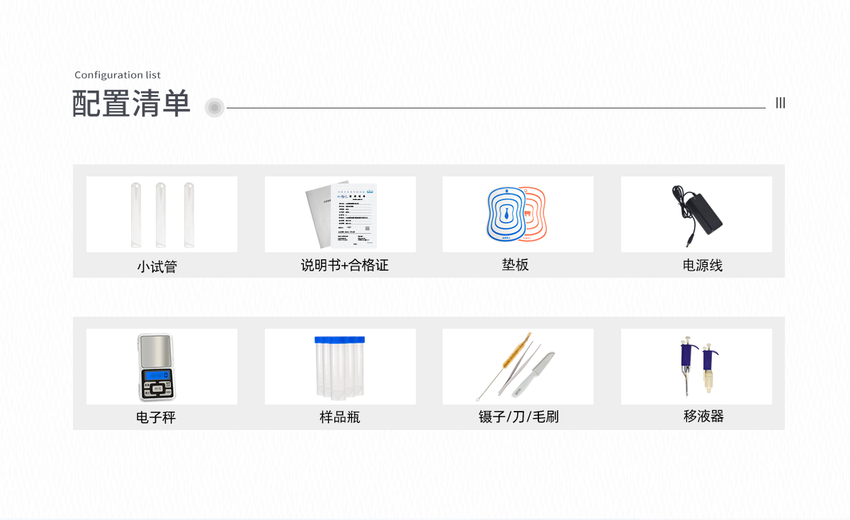 | 瘦肉精激素類(獸藥):鹽酸克倫特羅、沙丁胺醇、萊克多巴胺、己烯雌酚、喹乙醇等 | 抗生素殘留類(獸藥):四環素類、硝基呋喃類、磺胺類、沙星類、喹諾酮類、慶大霉素、鏈霉素、阿莫西林、紅霉素等 | 水產品安全類:孔雀石綠、氯霉素、呋喃妥因代謝、呋喃西林代謝、呋喃它酮代謝、呋喃唑酮代謝等 | 以及病害肉及肉類新鮮度的擴展檢測。 |