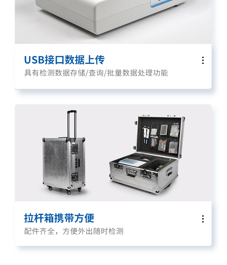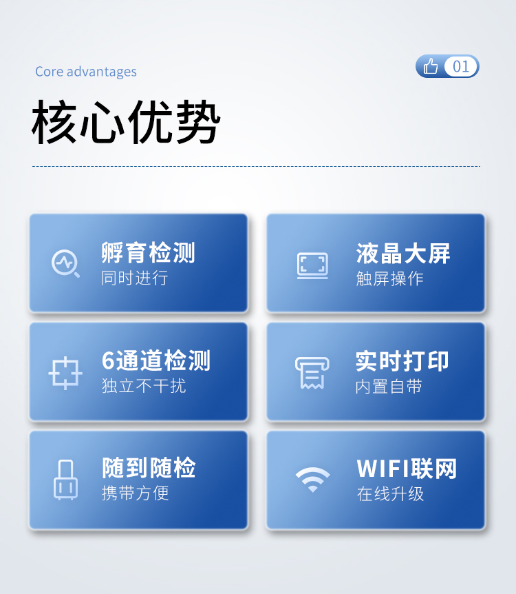 | 一體化設(shè)計,集成孵育和檢測功能同時進行,孵育完成直接檢測; | 全中文 7英寸高清液晶顯示,觸摸屏操作; | Android 系統(tǒng),支持在線升級,可WIFI聯(lián)網(wǎng); | 檢測原理:熒光定量免疫層析法; | 6通道設(shè)計,可同時進行一種或多種指標(biāo)的檢測,6個獨立檢測單元,檢測效率高,并且互不干擾; | 具有二維碼自動識別系統(tǒng),可直接識別檢測項目、檢測流程等信息; | 儀器自帶熱敏打印機,檢測結(jié)果可實時打印; | 具有檢測數(shù)據(jù)存儲(存儲數(shù)量不少于 10000 條)、查詢、批量數(shù)據(jù)處理和打印功能; | 儀器≥2 個USB 接口,可拷貝結(jié)果及原始數(shù)據(jù),具有 wifi 接入模塊,可通過無線連接網(wǎng) 絡(luò)實現(xiàn)數(shù)據(jù)上傳; | 分鐘內(nèi)達(dá)到工作狀態(tài)(37℃),封閉系統(tǒng),不受外界環(huán)境(光、熱)干擾,工作環(huán)境溫度:0-30℃; | 相對極差≤10%; | 重復(fù)性 CV≤1%; | 批間變異≤3%; | 尺寸310x210x93mm |