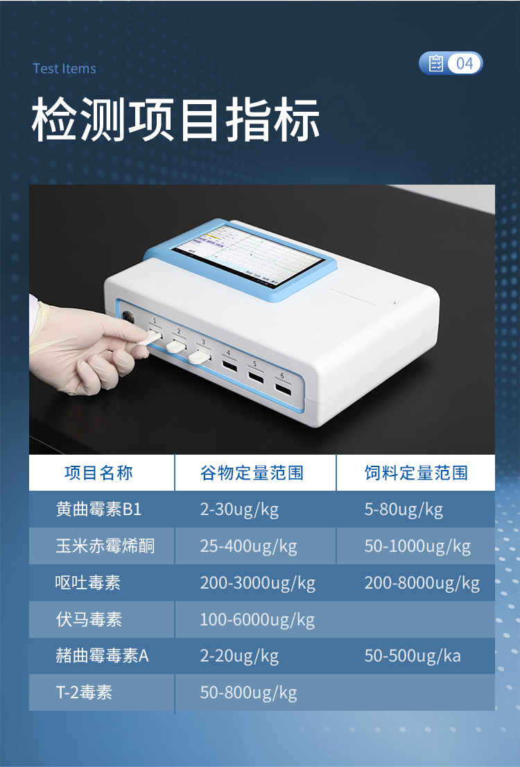 YT-L03P型真菌毒素快速檢測儀采用熒光定量快速檢測原理,主要檢測糧油谷物及飼料中真菌毒素和重金屬含量,包括黃曲霉毒素、玉米赤霉烯酮、嘔吐毒素、伏馬毒素、赭曲霉毒素、T-2毒素、重金屬鎘、重金屬鉛等等,檢測樣品涵蓋糧食谷物(大米、玉米、小麥、大麥、高粱等)及其制品、飼料及其原料、食用油脂、牛奶及其制品等;樣品前處理簡單,整個檢測過程檢測12min,產(chǎn)品適用于地方糧庫、谷物生產(chǎn)企業(yè)、飼料廠、各類畜牧養(yǎng)殖企業(yè)、面粉廠、食品加工廠、第三方檢測機(jī)構(gòu)及各級政府監(jiān)管部門。