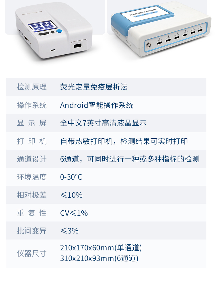 | 一體化設(shè)計,集成孵育和檢測功能同時進(jìn)行,孵育完成直接檢測; | 全中文 7英寸高清液晶顯示,觸摸屏操作; | Android 系統(tǒng),支持在線升級,可WIFI聯(lián)網(wǎng); | 檢測原理:熒光定量免疫層析法; | 6通道設(shè)計,可同時進(jìn)行一種或多種指標(biāo)的檢測,6個獨(dú)立檢測單元,檢測效率高,并且互不干擾; | 具有二維碼自動識別系統(tǒng),可直接識別檢測項(xiàng)目、檢測流程等信息; | 儀器自帶熱敏打印機(jī),檢測結(jié)果可實(shí)時打印; | 具有檢測數(shù)據(jù)存儲(存儲數(shù)量不少于 10000 條)、查詢、批量數(shù)據(jù)處理和打印功能; | 儀器≥2 個USB 接口,可拷貝結(jié)果及原始數(shù)據(jù),具有 wifi 接入模塊,可通過無線連接網(wǎng) 絡(luò)實(shí)現(xiàn)數(shù)據(jù)上傳; | 分鐘內(nèi)達(dá)到工作狀態(tài)(37℃),封閉系統(tǒng),不受外界環(huán)境(光、熱)干擾,工作環(huán)境溫度:0-30℃; | 真菌毒素和重金屬可同時進(jìn)行前處理,并同時上機(jī)檢測; | 儀器配備全套前處理設(shè)備,拉桿箱設(shè)計,即可用于實(shí)驗(yàn)室檢測可以外出攜帶檢測 | 相對極差≤10%; | 重復(fù)性 CV≤1%; | 批間變異≤3%; | 尺寸310x210x93mm |